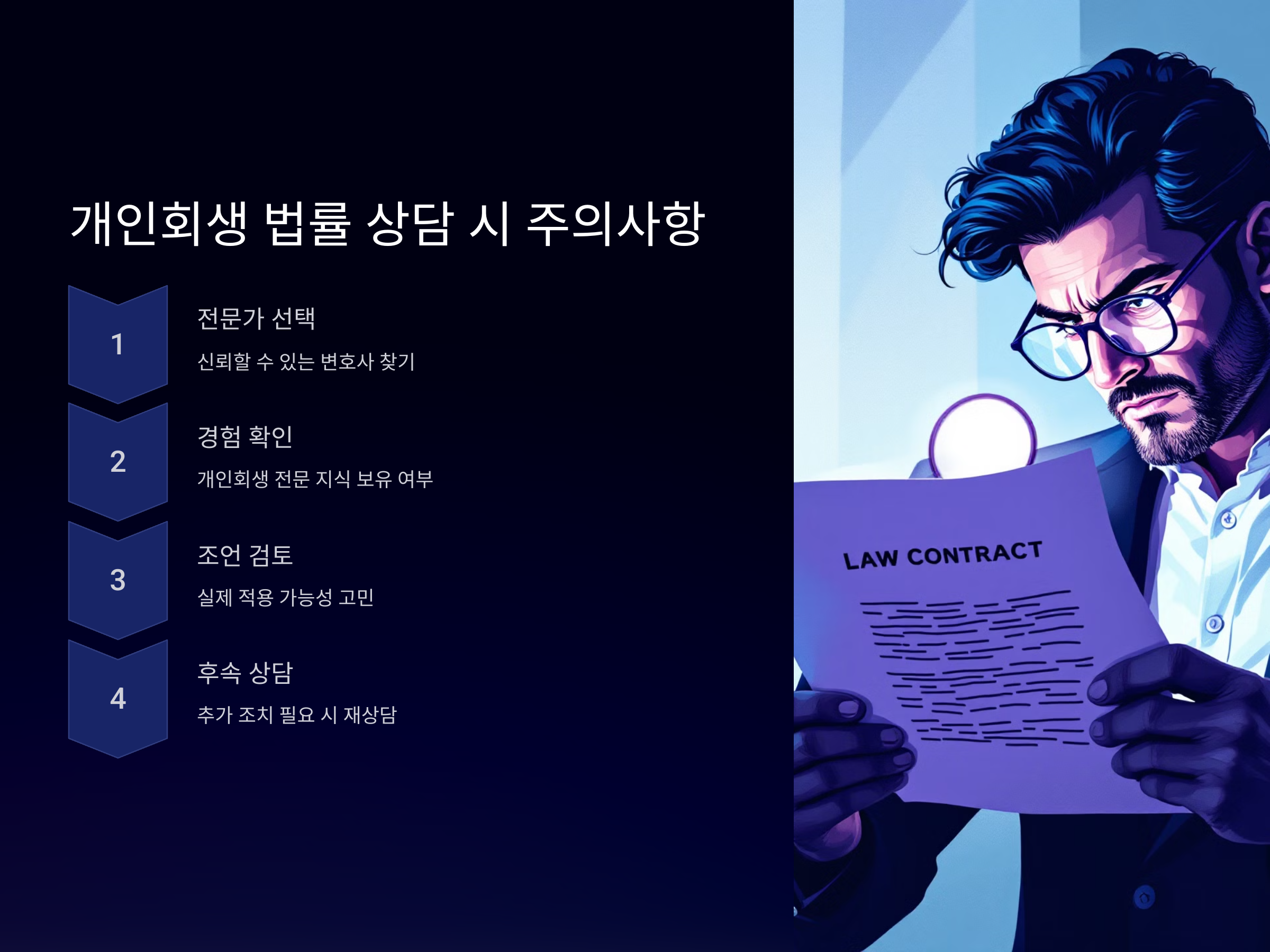 법률 상담을 받는 것은 개인회생 절차를 원활하게 진행하기 위한 첫 걸음입니다. 법률 전문가인 변호사나 상담사의 도움을 받으면, 자신의 상황에 맞는 최적의 해결책을 찾을 수 있습니다. 개별적인 상황에 따라 맞춤형 조언을 받을 수 있기 때문에, 자신이 선택해야 할 절차가 무엇인지 명확히 알 수 있습니다.