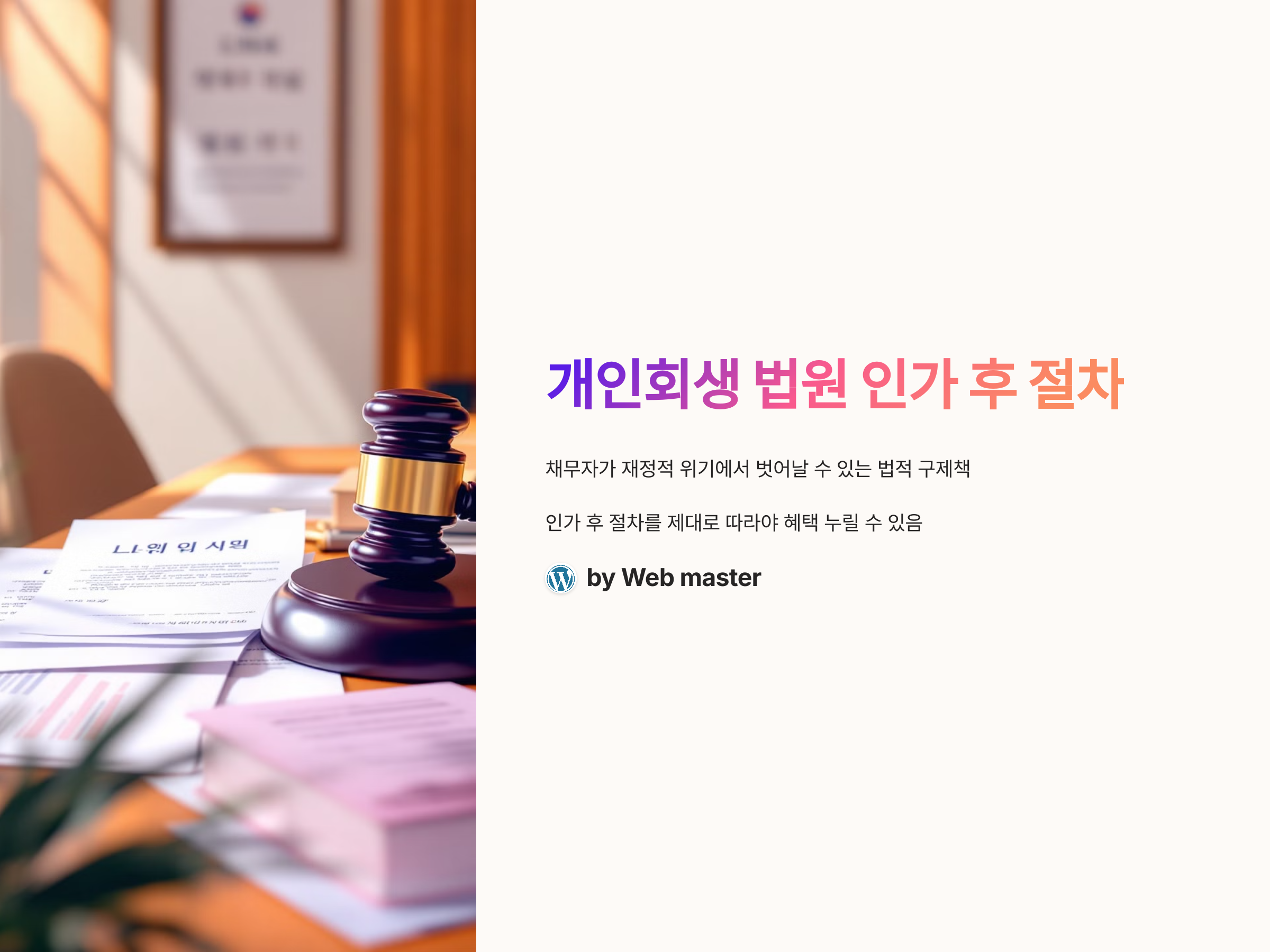 개인회생 절차는 채무자가 재정적 위기에서 벗어날 수 있는 중요한 법적 구제책입니다. 그러나 법원에서 인가를 받은 후에도 여러 중요한 절차들이 남아있습니다. 본 포스팅에서는 개인회생 법원 인가 후, 채무자가 따라야 할 중요한 절차들을 단계별로 소개합니다.