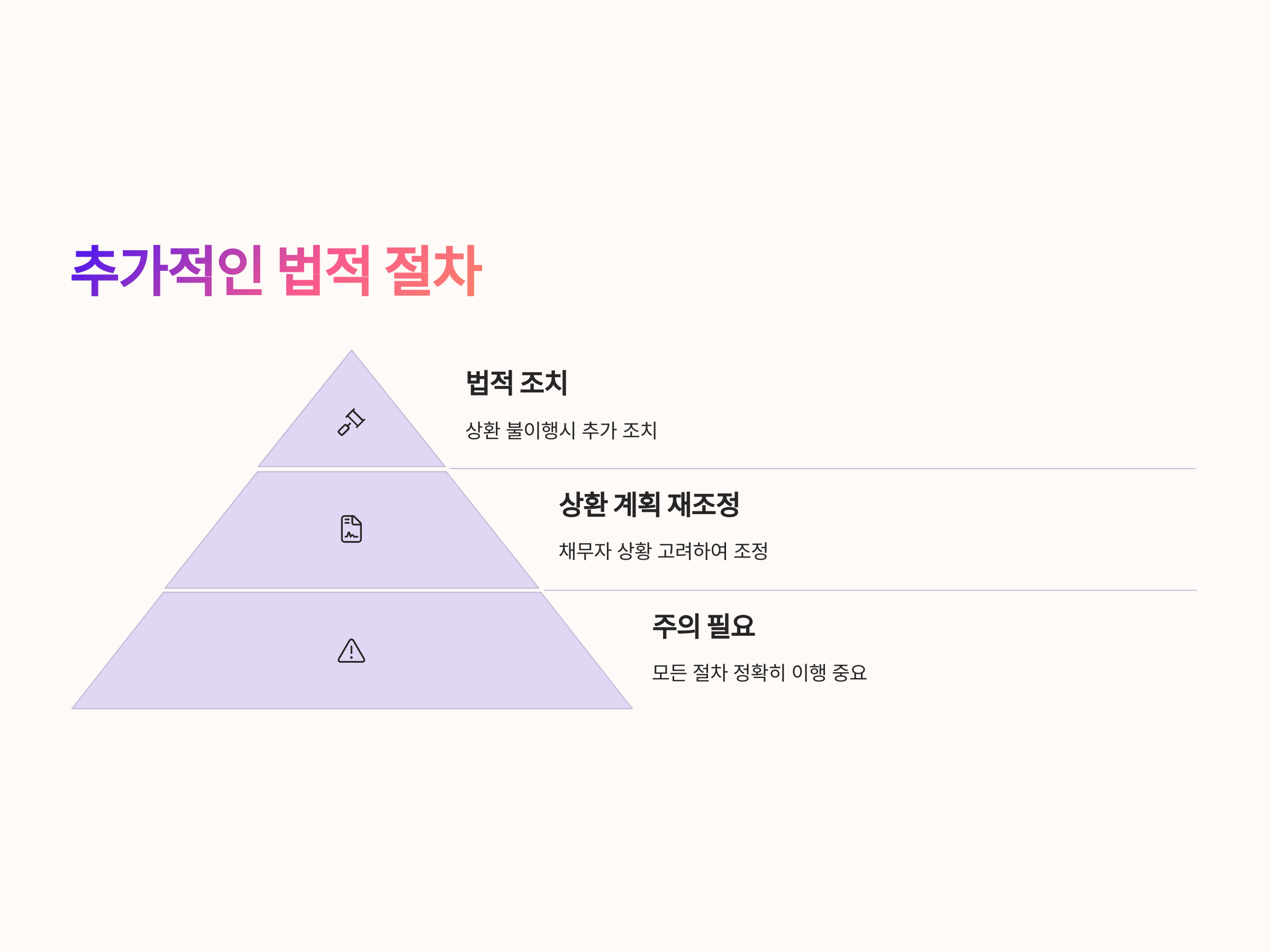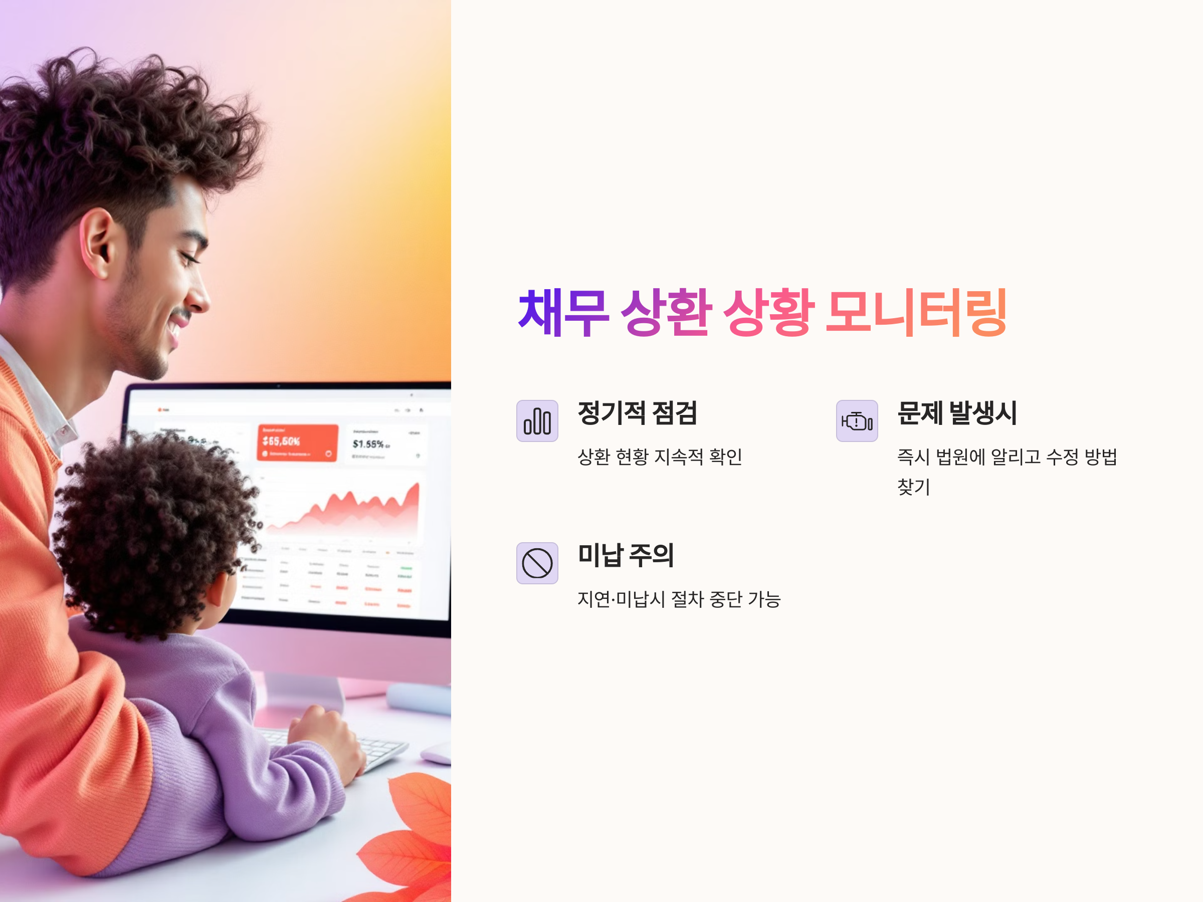 이행 계획을 수립한 후, 채무자는 실제로 상환을 진행하면서 상환 현황을 정기적으로 점검해야 합니다. 매월 정해진 상환금을 납부하는 과정에서, 만약 상환에 문제가 생긴다면 즉시 법원에 이를 알리고 수정할 수 있는 방법을 찾는 것이 중요합니다.