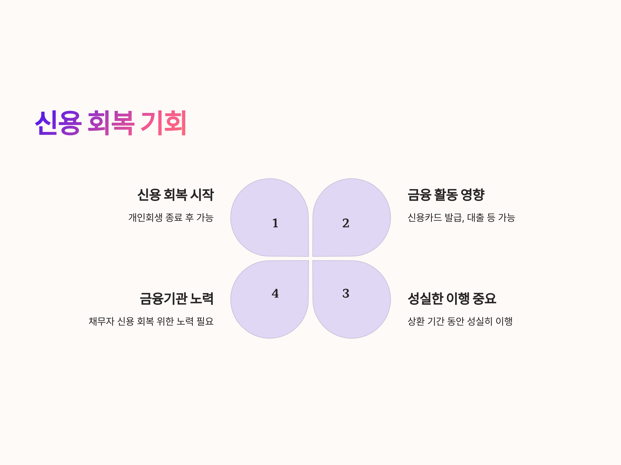 개인회생이 종료되면, 법원은 채무자에게 신용 회복의 기회를 부여할 수 있습니다. 개인회생 절차를 통해 일부 채무가 면제되었고, 상환을 완료한 채무자는 일정 기간 후 신용 회복이 가능해집니다. 이는 신용카드 발급, 대출 등을 포함한 여러 금융 활동에 영향을 미칠 수 있습니다.