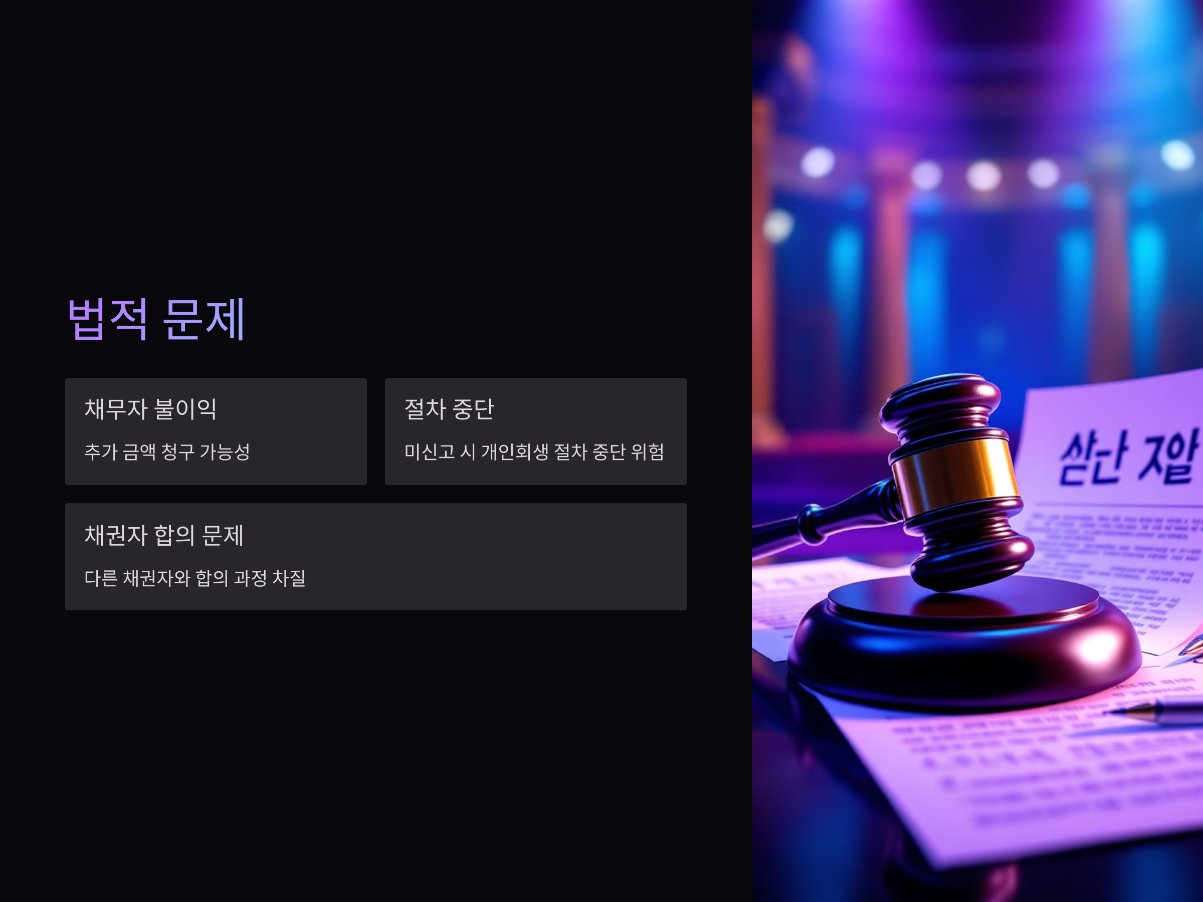 또한, 변제금 과오납을 신고하지 않으면, 법원에서 개인회생 절차를 중단할 수 있는 경우도 있습니다. 따라서 변제금 과오납이 발생하면 빠르게 신고하고, 법적인 문제를 방지하기 위해 모든 절차를 정확히 진행해야 합니다.