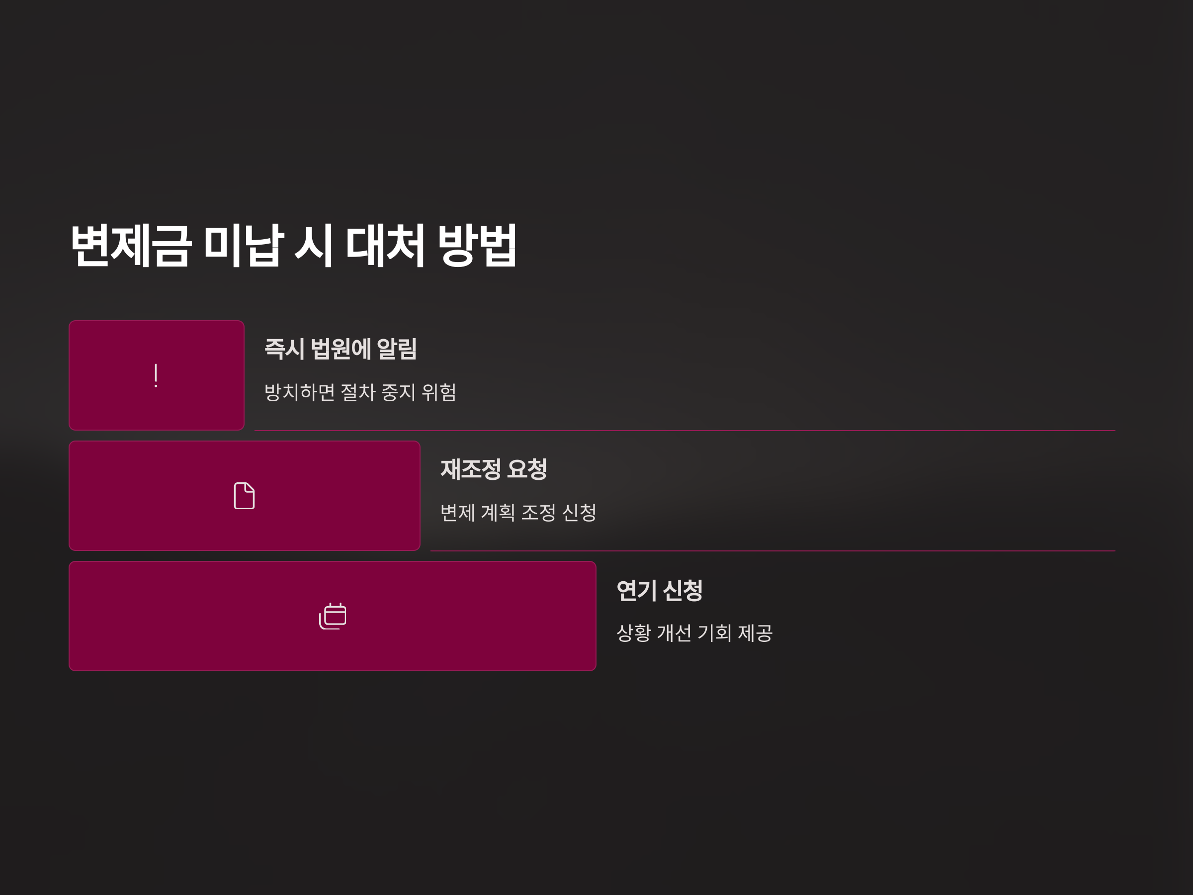 법원은 일부 상황에 따라 납부 연기를 허용하기도 하며, 연기된 기간 동안 채무자가 상황을 개선할 수 있도록 기회를 제공하기도 합니다. 그러나 연기 신청이 거부될 수 있기 때문에, 변제금 납부는 가능한 한 기한 내에 완료하는 것이 가장 좋습니다.
