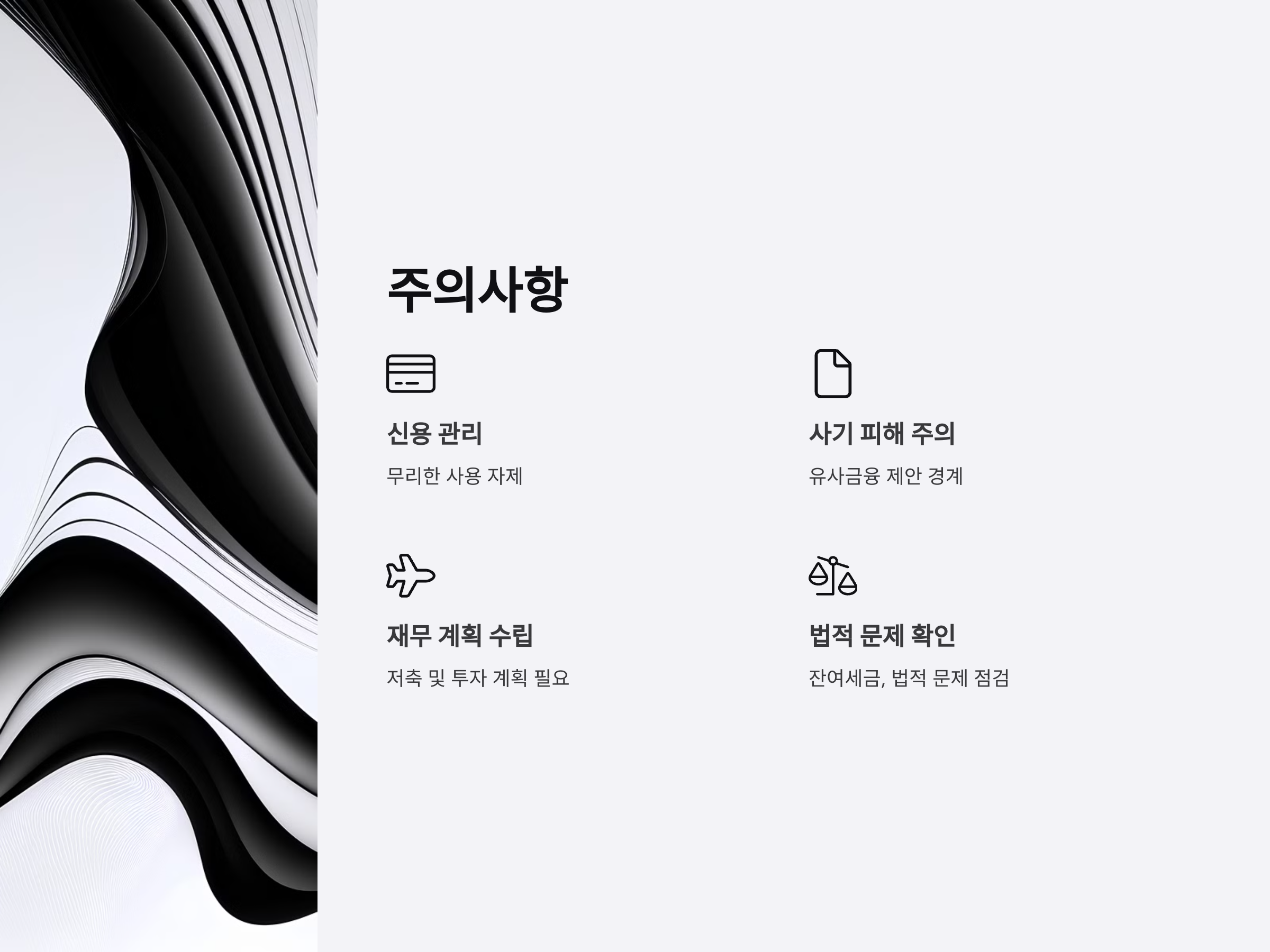완납 이후 신용을 무리하게 사용하면 또다시 경제적 문제에 빠질 수 있습니다. 특히, 카드 사용이나 대출 관리를 철저히 하고 소득과 지출을 균형 있게 유지해야 합니다.