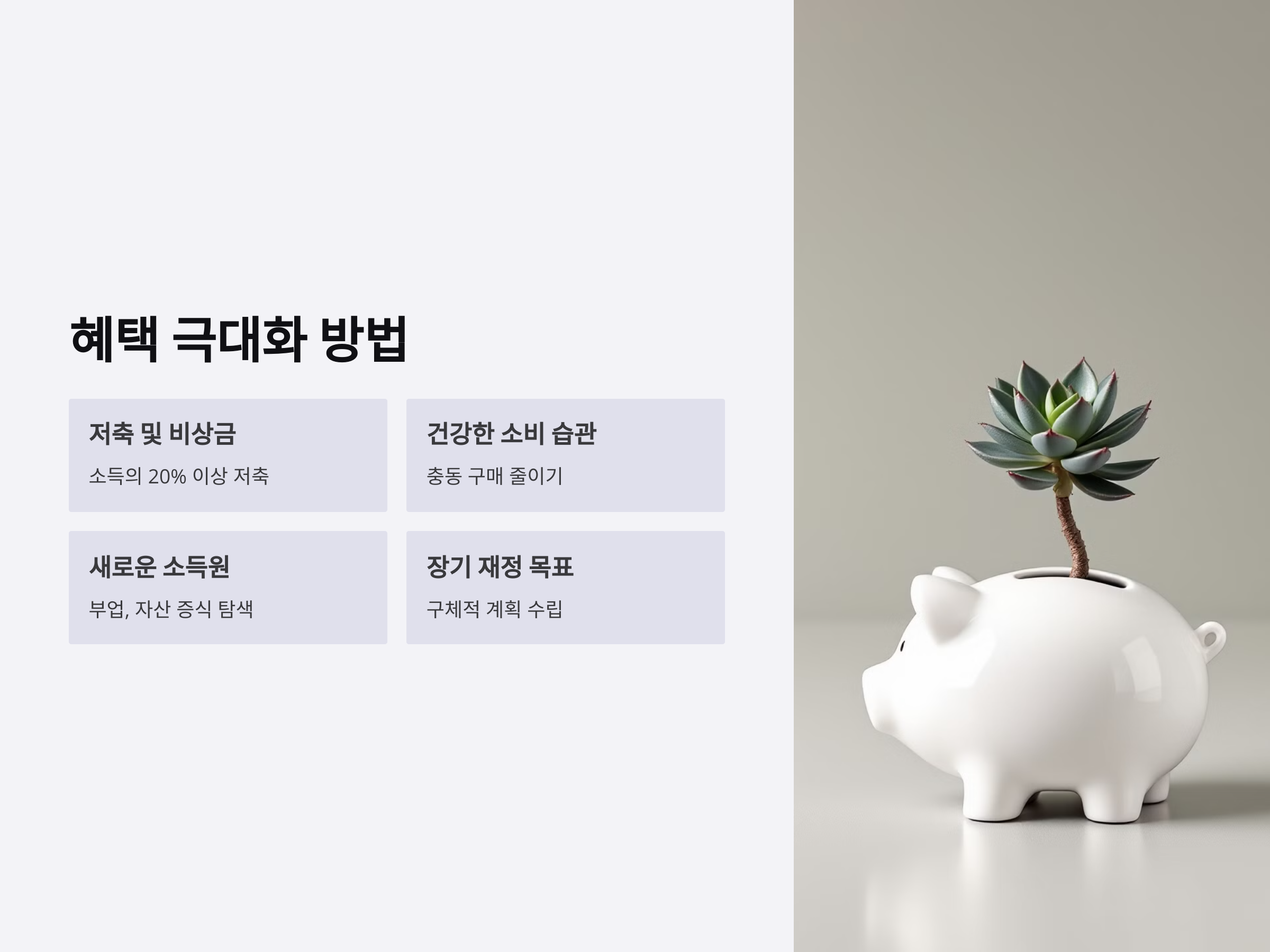 충동 구매를 줄이고, 필요하지 않은 지출을 통제하여 경제적 안정을 유지하세요. 현금 사용 습관을 들이면 더욱 도움이 됩니다.
