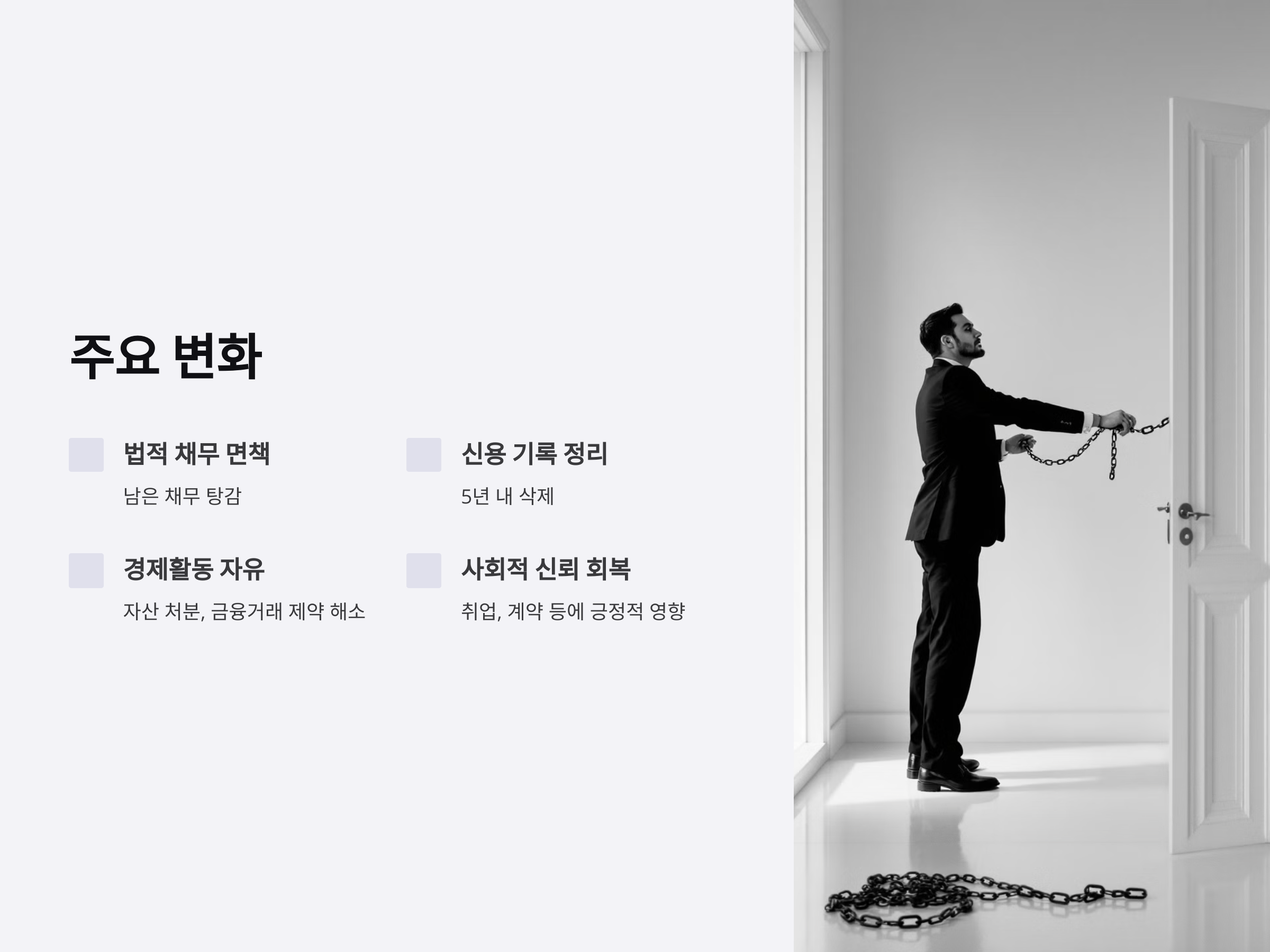 개인회생 과정에서 제한되었던 자산의 처분이나 금융거래 제약이 해소됩니다. 예를 들어, 추가적인 자산 취득이나 사업 확장 등의 활동이 가능해집니다.