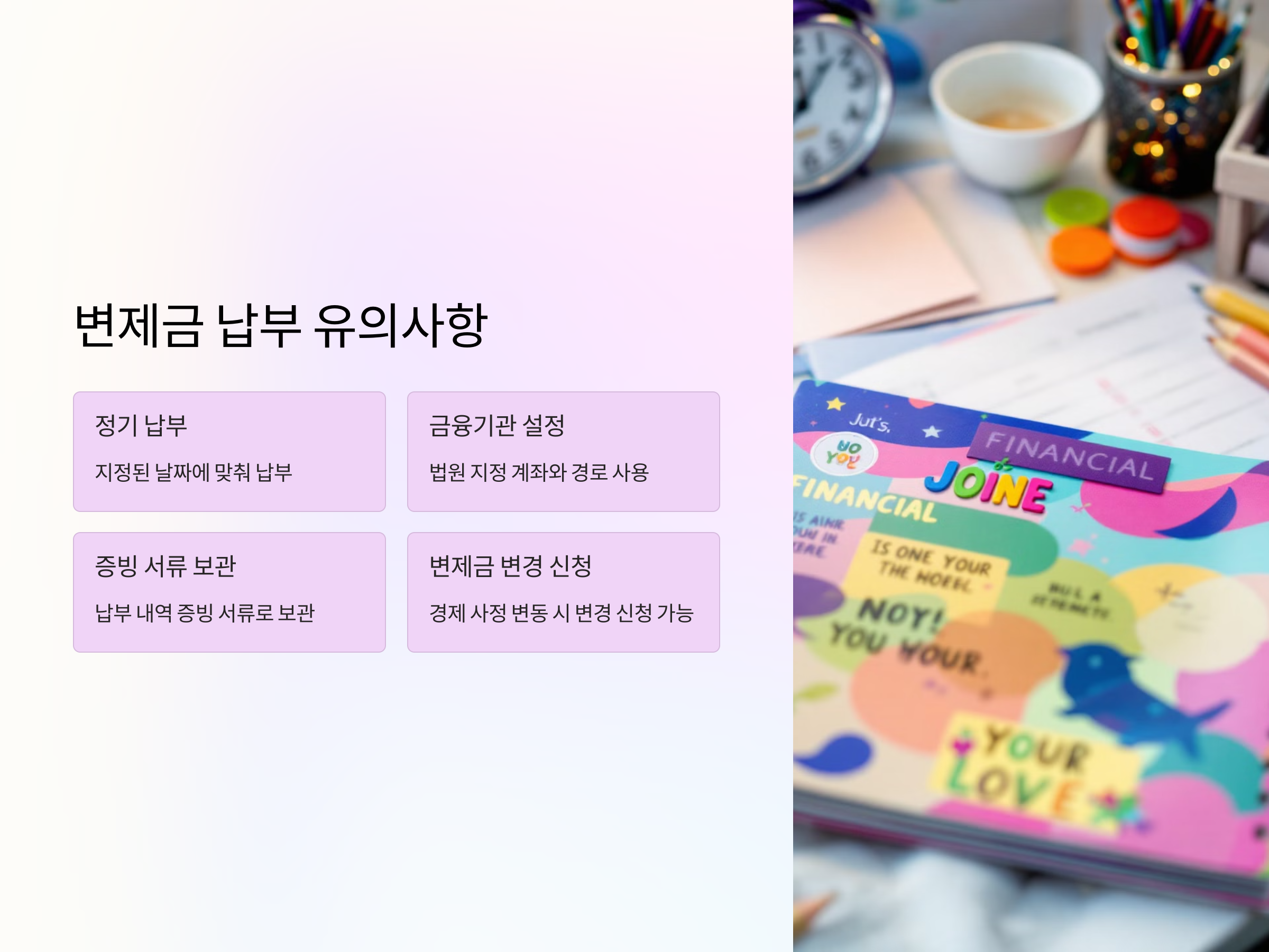 - 정기 납부: 변제금은 지정된 날짜에 맞춰 납부해야 합니다.