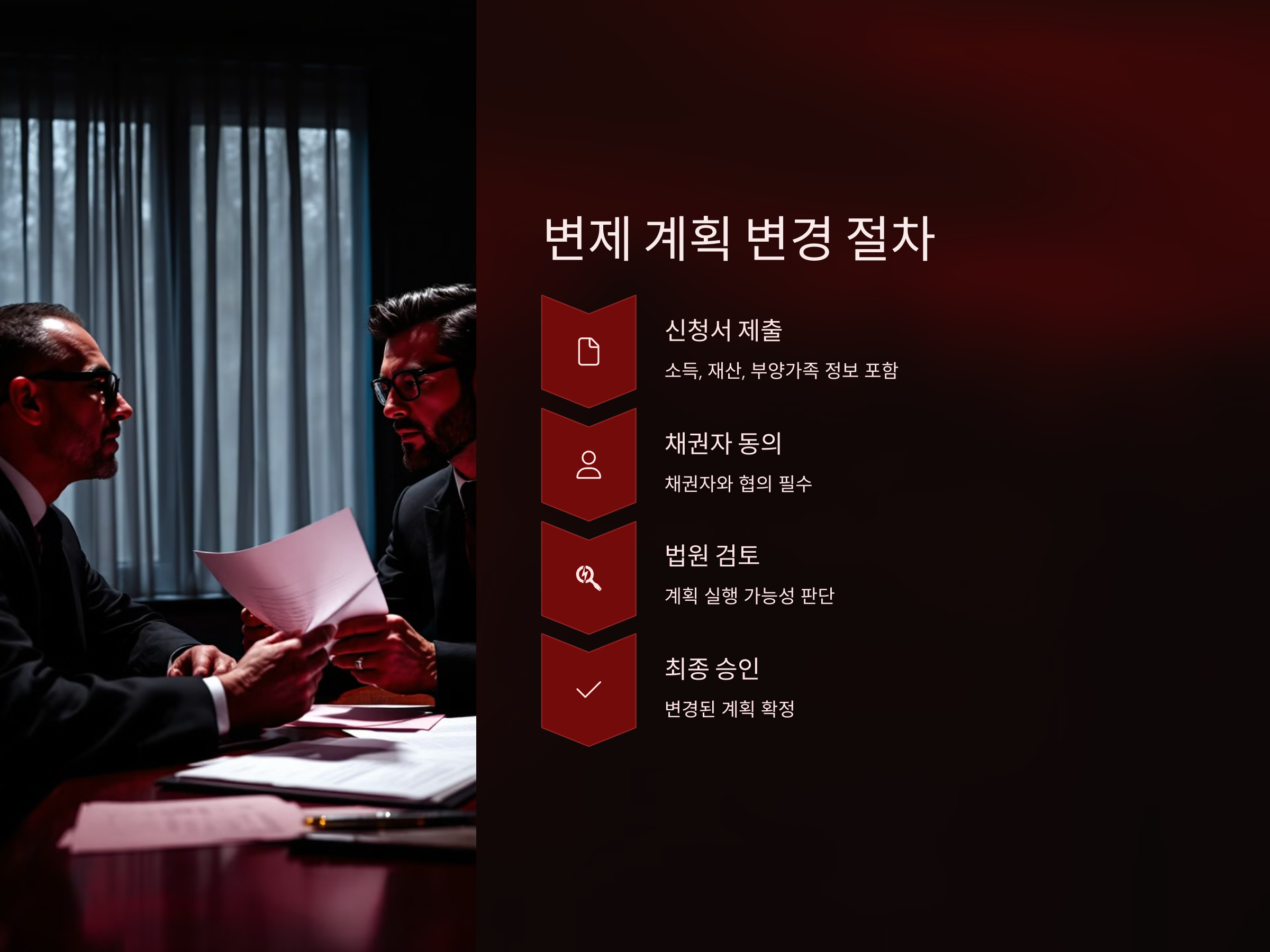 변제 계획의 변경을 요청하는 이유는 반드시 증빙자료와 함께 법원에 제출해야 하며, 법원은 채무자의 재정 상태를 면밀히 검토한 후 결정합니다. 이 과정에서 채무자의 신용도, 소득 상황, 재산 상태 등을 고려하여 계획이 변경될 수 있습니다.