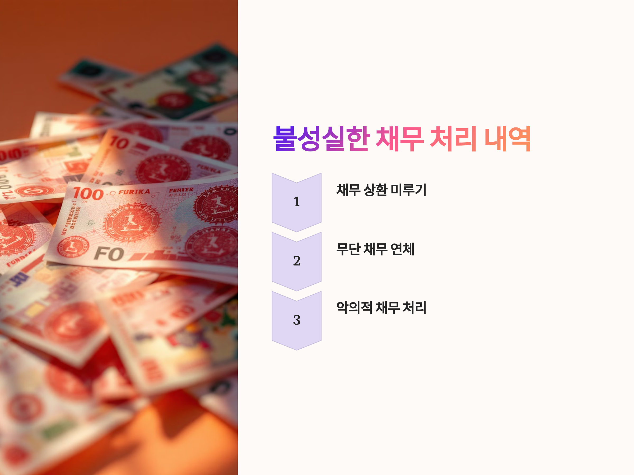채무자가 그동안 채무를 불성실하게 처리한 경우, 즉, 채무 상환을 미루거나 무단으로 채무를 연체한 내역이 있는 경우에도 부결 사유가 될 수 있습니다. 특히, 악의적인 채무 연체나 상환을 의도적으로 미뤘다면 법원은 이를 불성실한 채무 처리로 간주하여 신청을 부결할 수 있습니다.