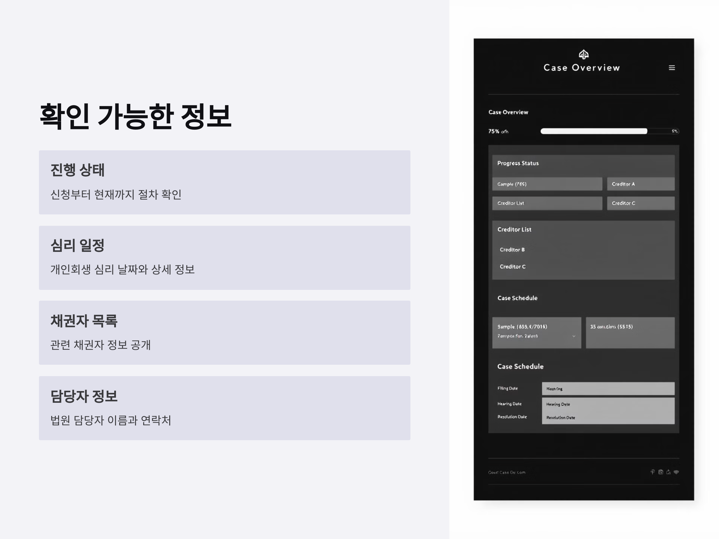- 진행 상태: 사건이 신청부터 어떤 절차를 거쳤는지에 대한 상태가 표시됩니다. 예를 들어, "채권자 회의 예정", "재판부 결정", "개인회생 승인" 등의 정보가 제공됩니다.