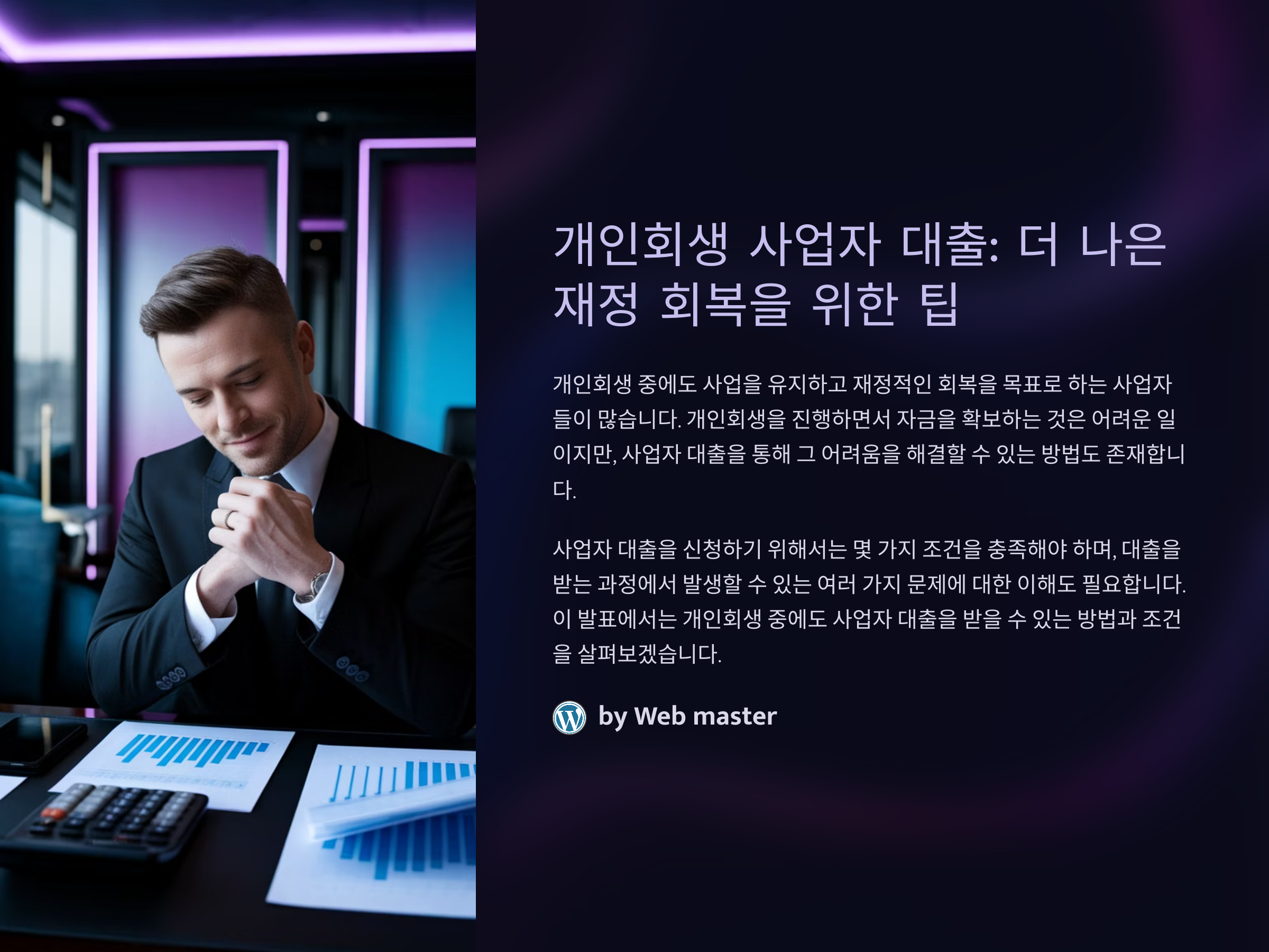 - 재정적 안정: 개인회생 절차를 통해 재정적 안정감을 얻을 수 있으며, 대출을 통해 사업의 미래를 위한 계획을 세울 수 있습니다.