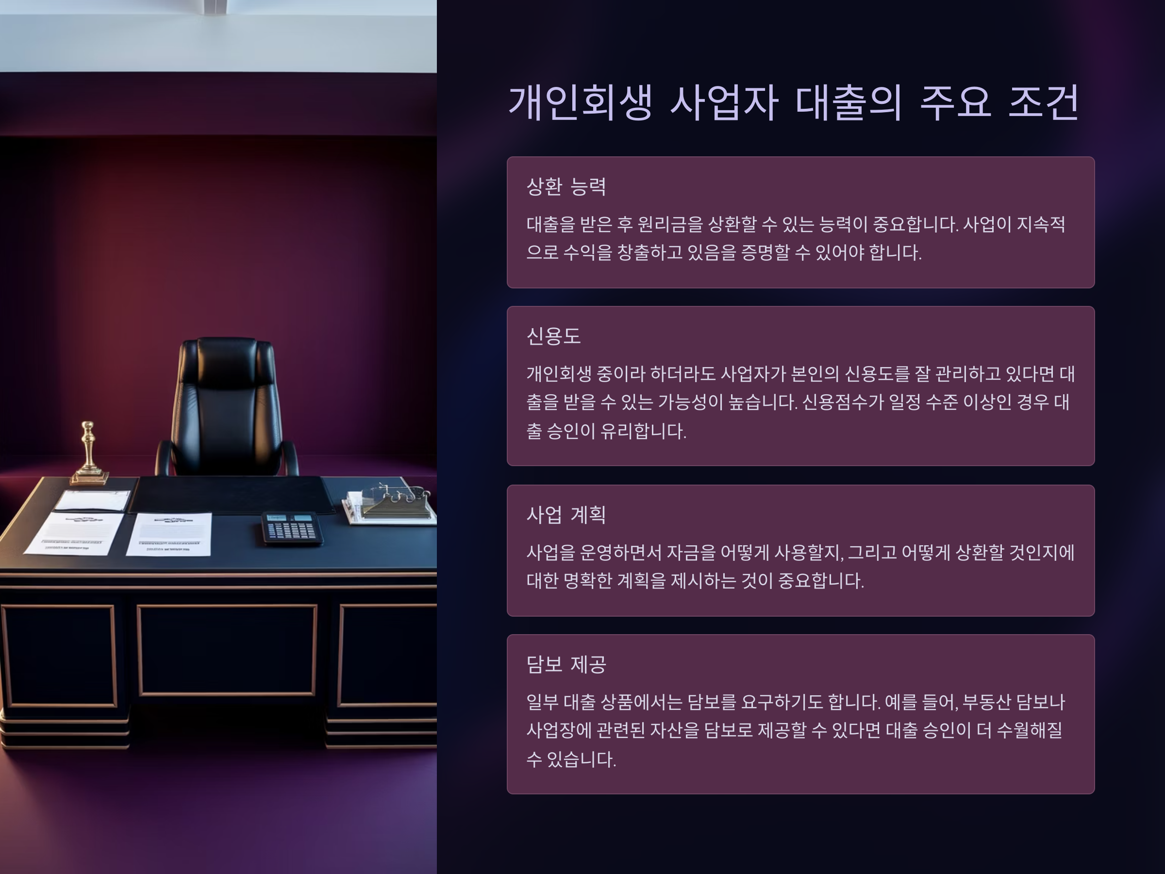 개인회생 중 사업자 대출을 받기 위해서는 몇 가지 중요한 조건을 충족해야 합니다. 사업자 대출을 승인받기 위한 조건을 살펴보겠습니다.
