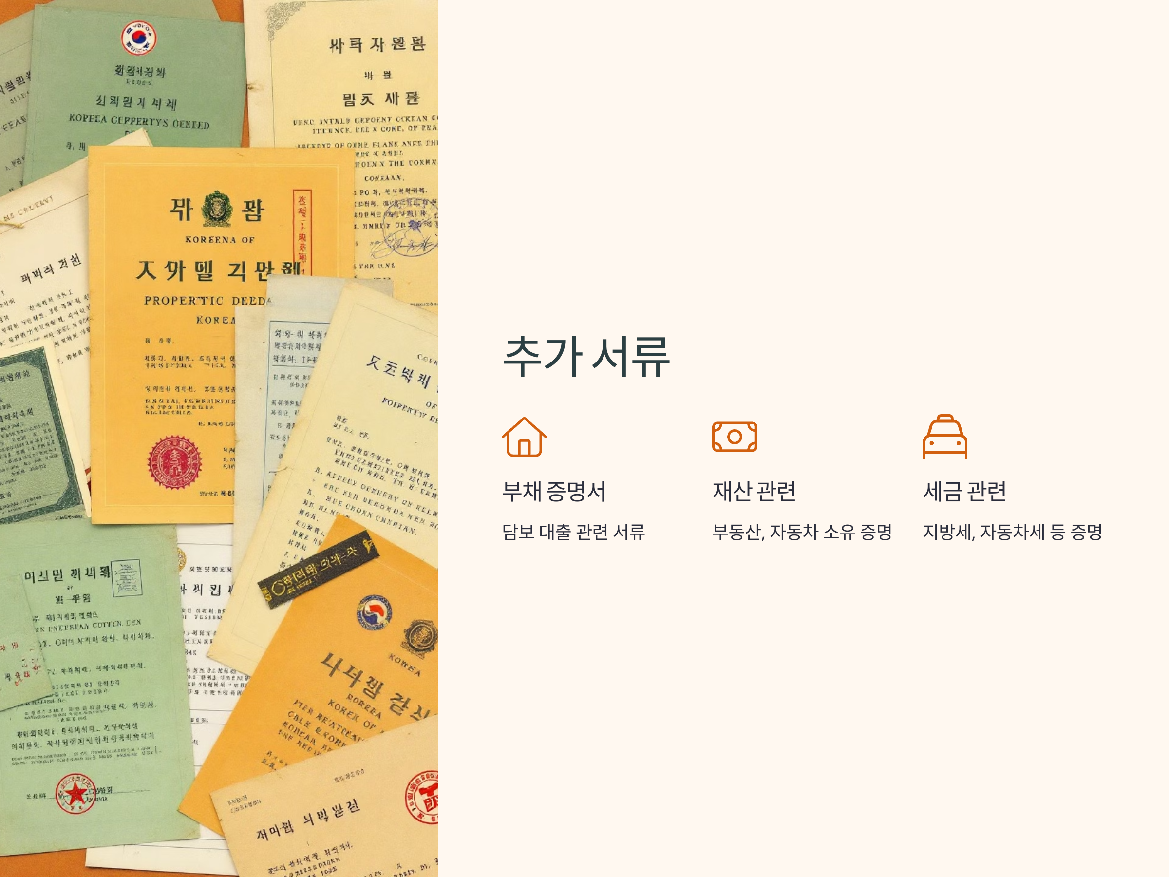 본인의 소득이나 재산을 증명할 수 있는 서류도 필요할 수 있습니다. 예를 들어, 부동산 소유 여부, 자동차 소유 여부 등의 재산 내역을 확인할 수 있는 서류를 제출해야 합니다.
