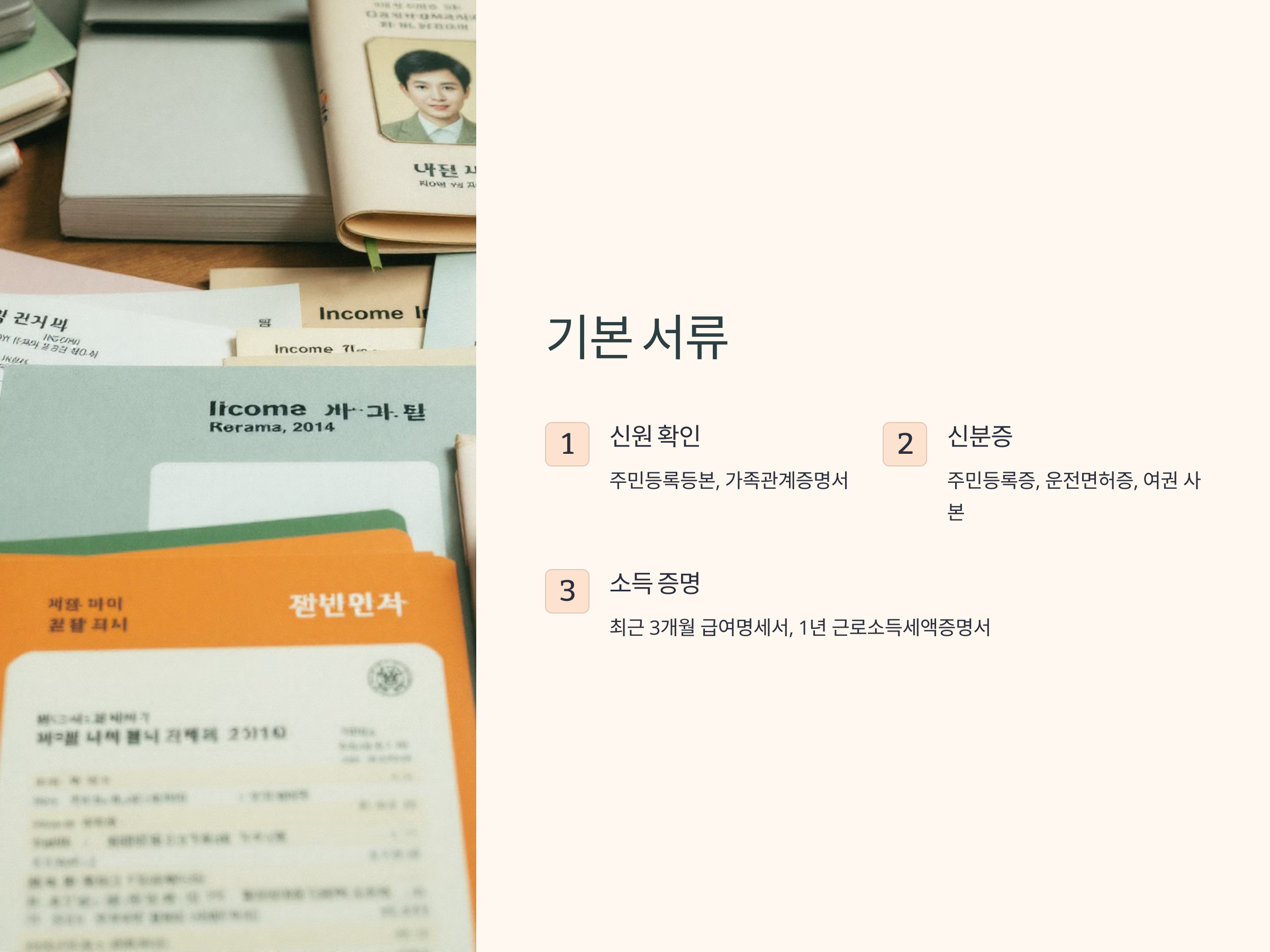 가장 기본적인 서류로, 신청자의 신원 확인을 위한 자료입니다. 주민등록등본은 신청자의 현재 주소지와 가구원을 확인하는 데 사용되며, 가족관계증명서는 가족 관계를 증명하는 서류입니다.