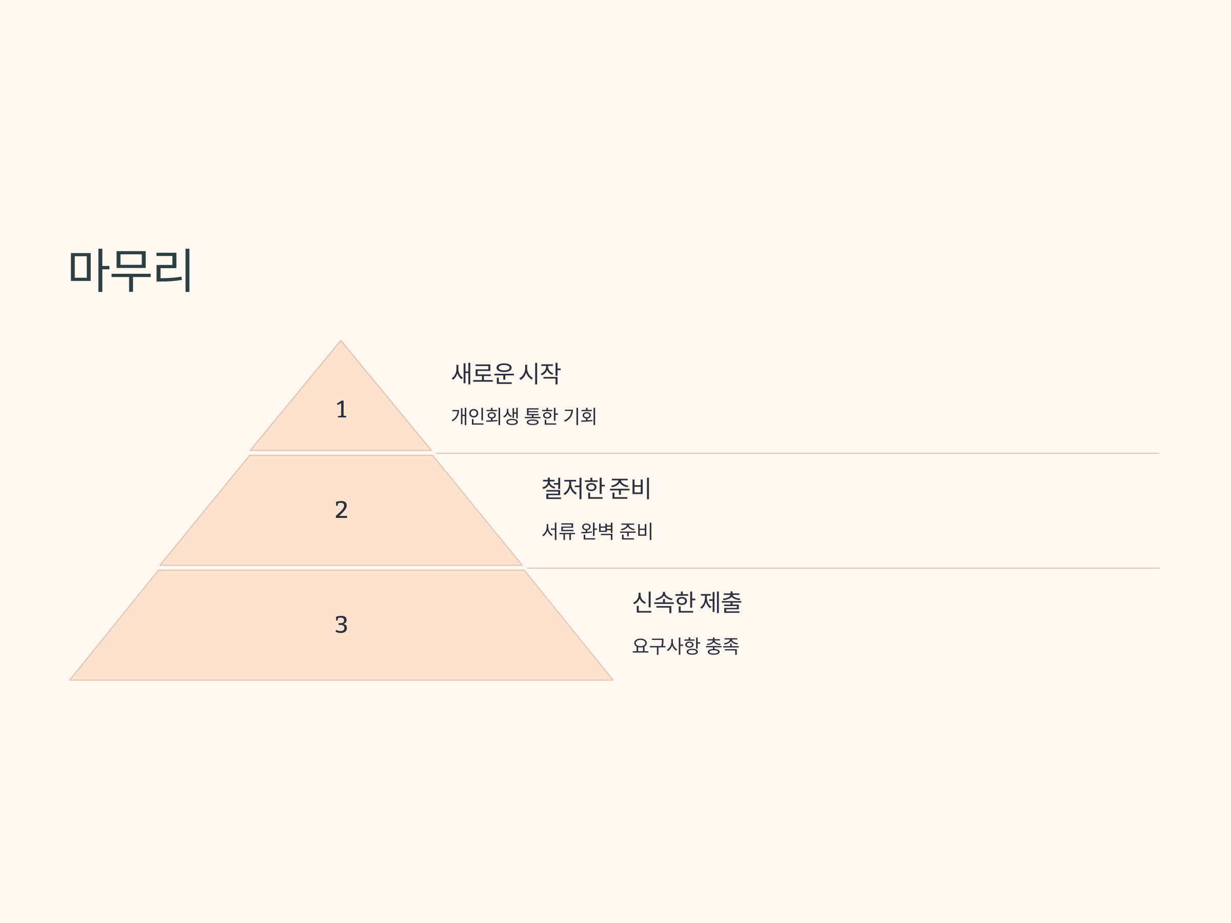 개인회생 절차는 체계적으로 서류를 준비하고 신청하는 것이 중요합니다. 필요 서류를 빠짐없이 준비하고, 법원의 요구사항을 충족시키는 것이 승인의 핵심입니다. 어려운 상황에서도 개인회생을 통해 새로운 시작을 할 수 있는 기회를 얻을 수 있습니다. 따라서, 철저한 준비와 신속한 서류 제출이 중요합니다.
