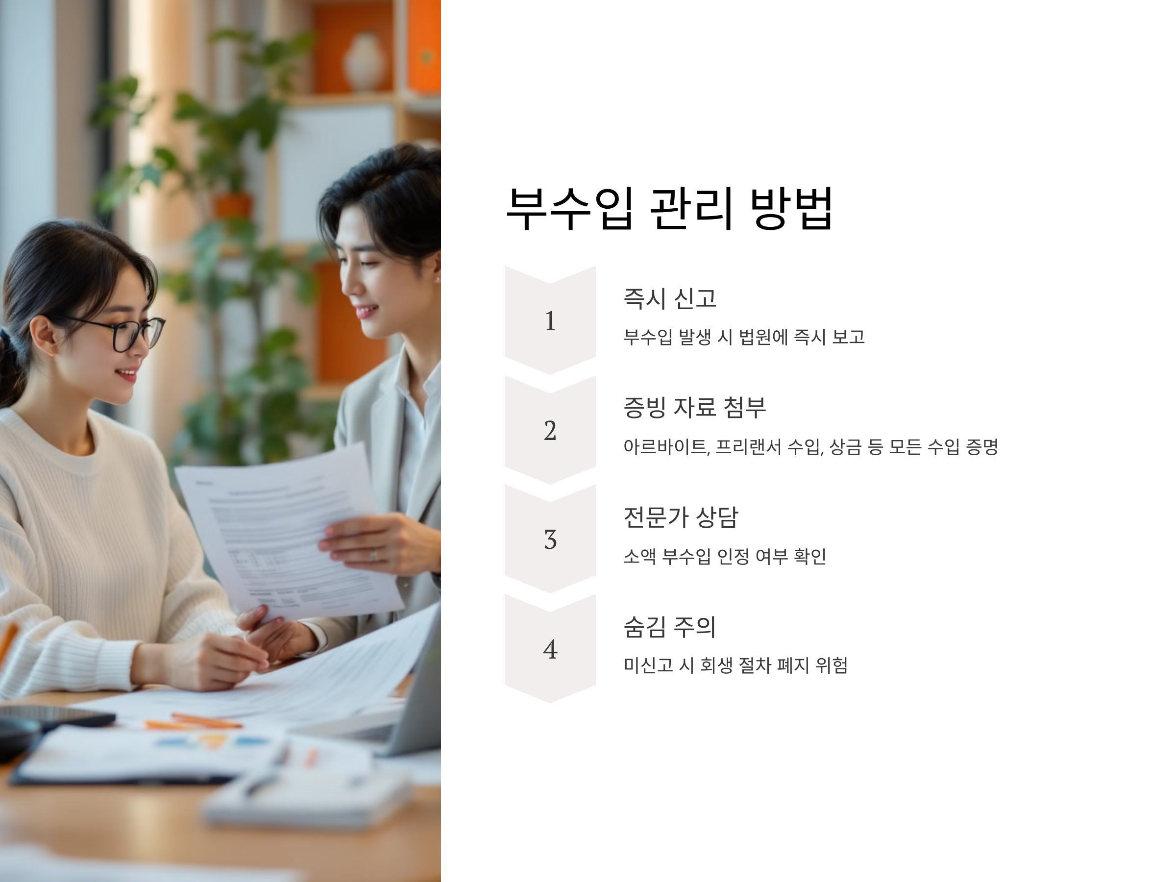 변제 중 부수입이 생기면, 이를 즉시 법원에 신고해야 합니다. 추가 소득이 생기면 변제금 증액 사유가 되기 때문인데, 이를 숨기고 사용하다 적발되면 회생 절차가 폐지될 수 있습니다. 따라서 아르바이트, 프리랜서 수입, 상금 등 예상 외 수입이 발생하면, 관련 자료를 첨부해 법원에 보고하는 것이 중요합니다. 다만, 생활 유지에 필수적인 수준의 소액 부수입은 인정되는 경우도 있으니 전문가 상담을 통해 적절한 대응을 준비해야 합니다.