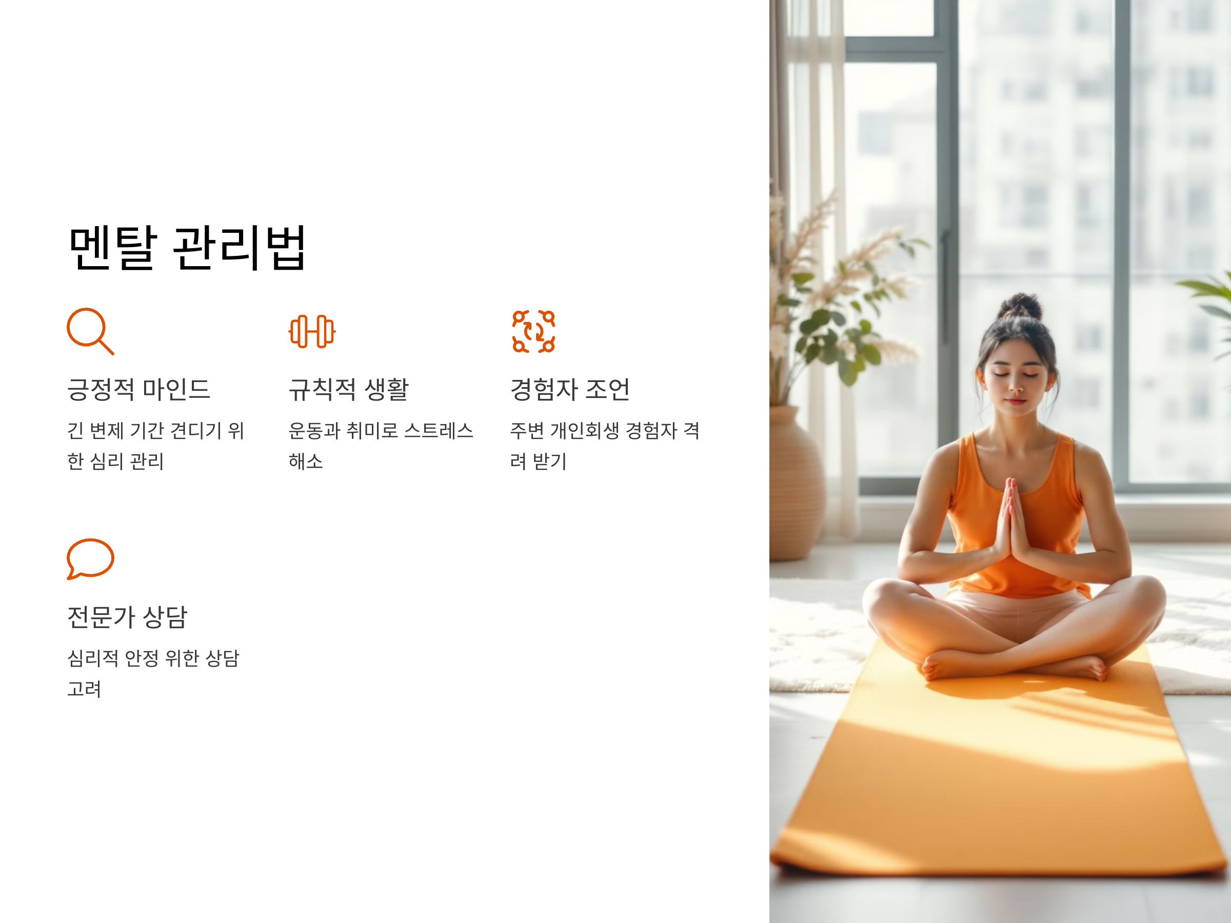 변제 기간 동안 정신적인 스트레스가 상당합니다. 긴 변제 기간을 견디기 위해서는 긍정적인 마인드 유지가 필요하며, 규칙적인 생활 습관과 운동, 취미 생활을 통해 스트레스를 해소해야 합니다. 또한 주변에 개인회생 경험자가 있다면, 조언을 듣고 격려를 받는 것도 큰 도움이 됩니다. 전문가 상담을 통해 심리적 안정을 취하는 것도 고려해 볼만한 방법입니다.