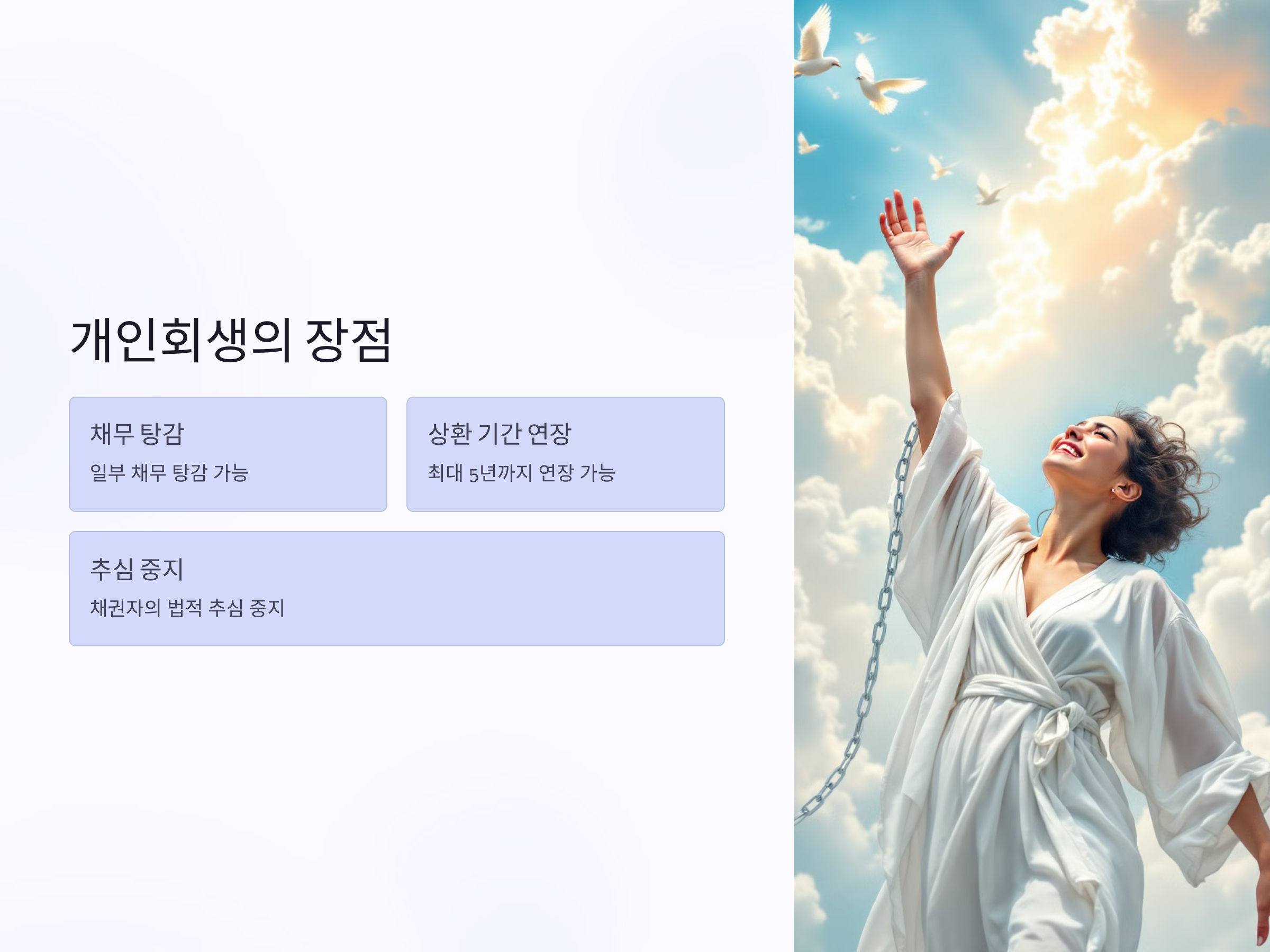 개인회생을 신청하면 많은 장점이 있습니다. 그 중 주요한 장점은 다음과 같습니다: