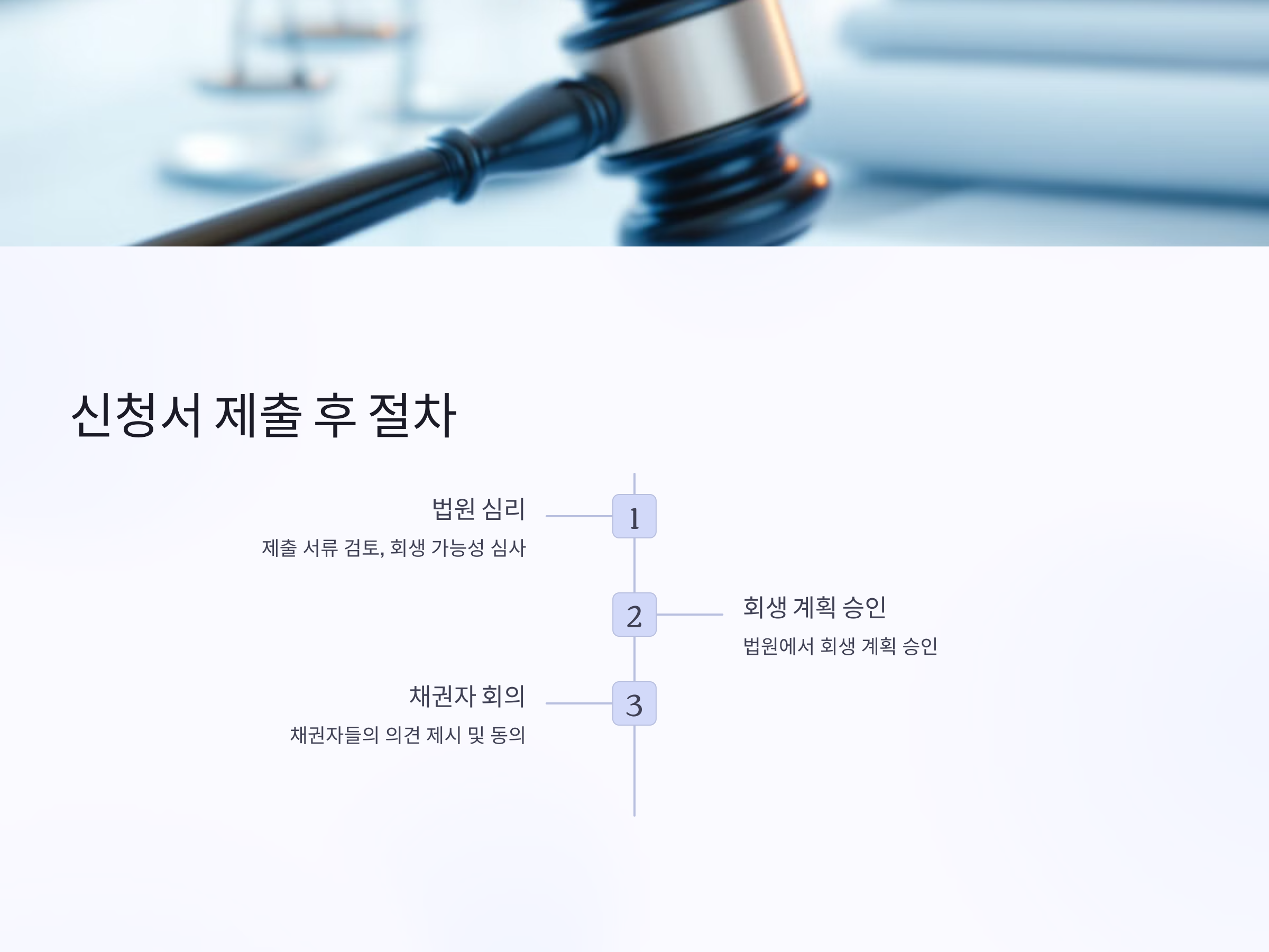 - 법원에서는 제출된 신청서와 증빙 서류를 검토하고, 채무자의 회생 가능성 여부를 심사합니다. 이때 채무자의 채무 상황, 소득, 재산 등을 종합적으로 고려합니다.