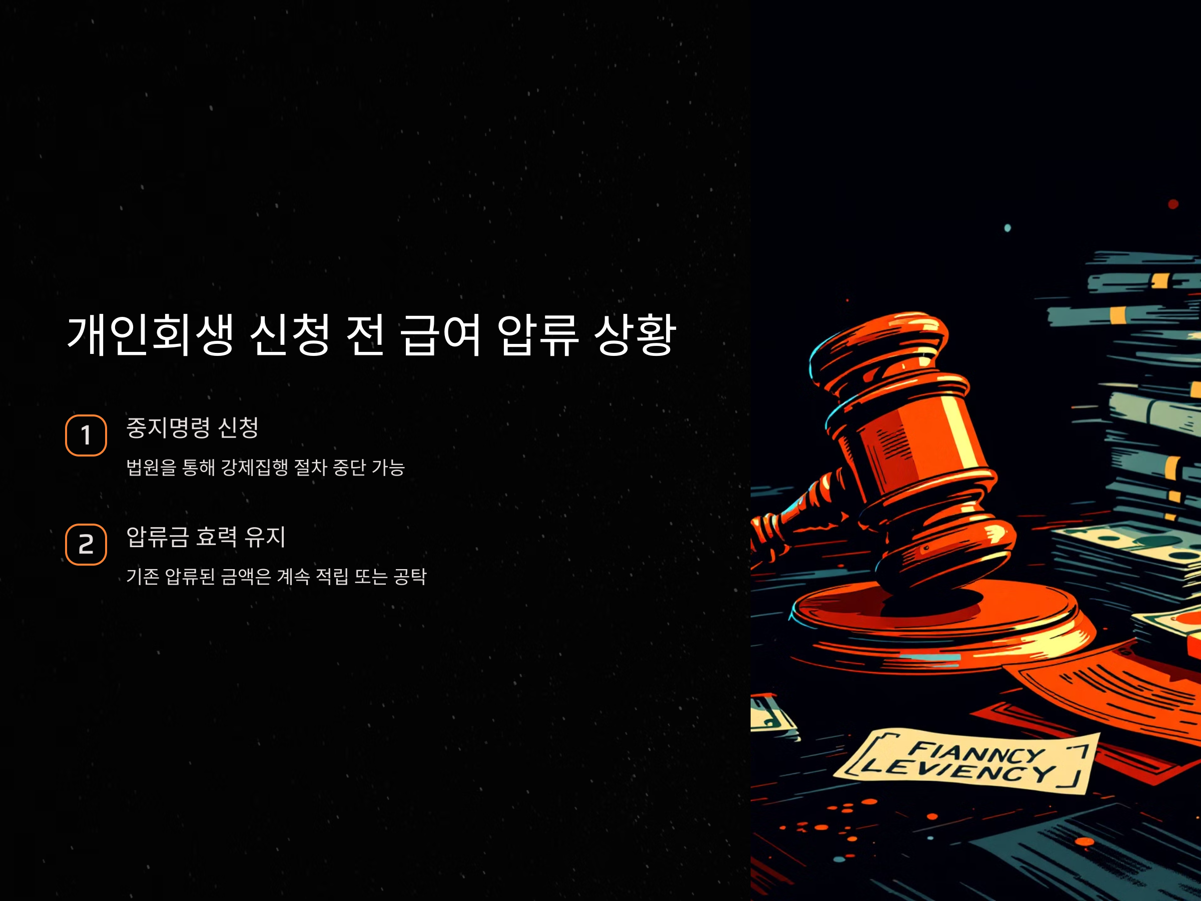 개인회생을 신청하기 전에 이미 급여에 압류가 진행된 경우, 채무자는 법원을 통해 중지명령을 신청할 수 있습니다. 중지명령이 발령되면, 기존의 강제집행 절차는 중단되지만, 이미 압류된 금액에 대한 효력은 유지됩니다. 따라서 중지명령 이후에도 회사는 압류된 급여를 적립하거나 공탁해야 합니다. citeturn0search0