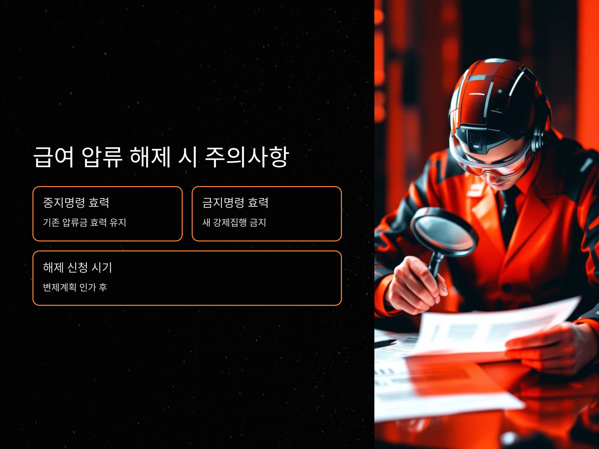 - 중지명령과 금지명령의 효력: 중지명령은 기존의 강제집행을 중단시키지만, 이미 압류된 금액의 효력을 소멸시키지는 않습니다. 반면, 금지명령은 새로운 강제집행을 금지합니다. citeturn0search4