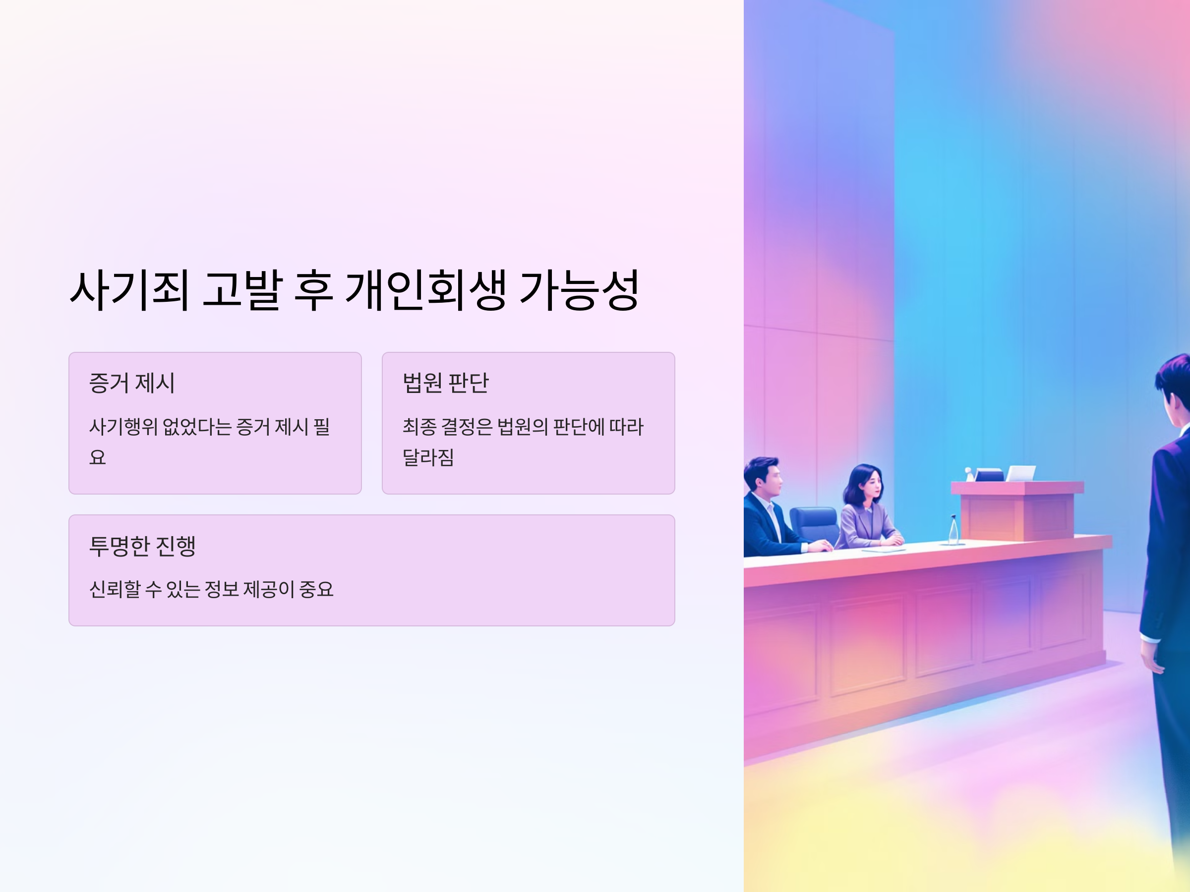 개인회생 신청을 통해 채무를 해결하려는 사람들은 사기죄와 같은 법적 문제를 피하기 위해 반드시 정확한 절차를 밟아야 합니다. 자산 은닉, 허위 신고 등의 행위는 사기죄를 초래할 수 있기 때문에 법적 위험을 최소화하기 위한 노력이 필요합니다. 개인회생을 고려하고 있다면, 전문가와 상담을 통해 법적 절차에 맞는 올바른 신청을 하도록 합시다.