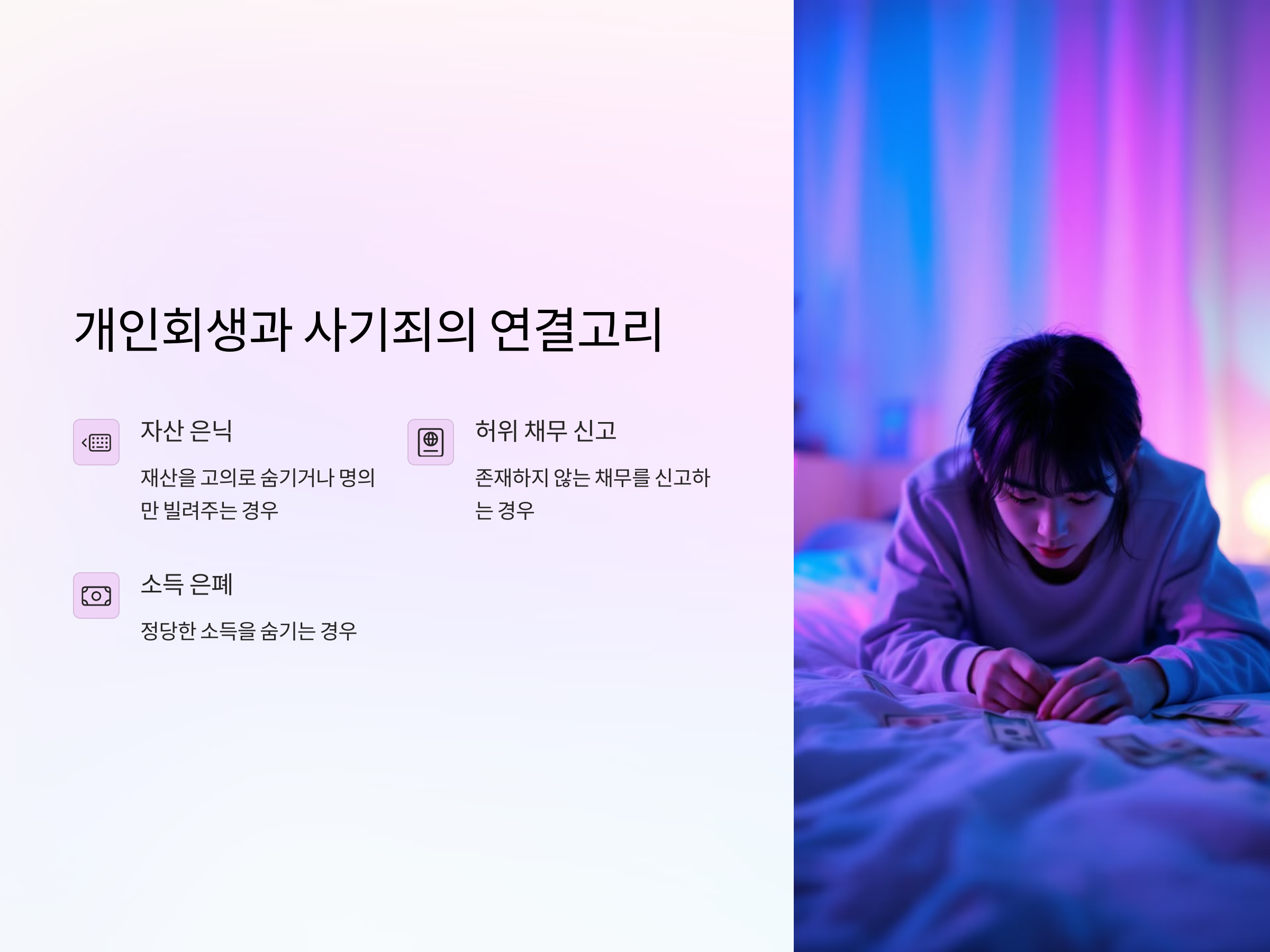 - 불법적인 소득 은폐: 정당한 소득을 숨기고 부채가 많다는 사실을 꾸며낸 경우