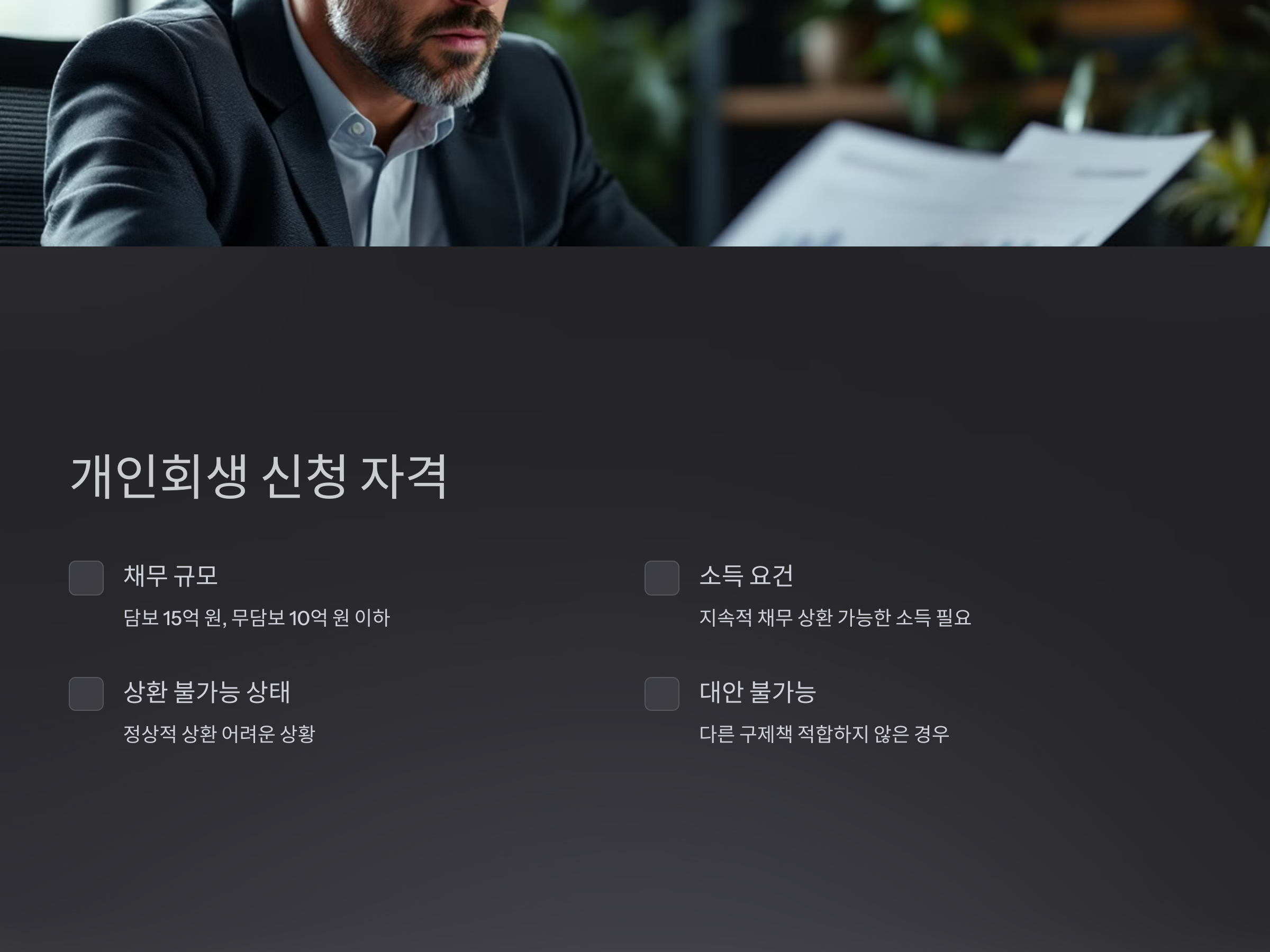 - 지속적으로 채무를 일정 부분 상환할 수 있는 소득이 있어야 합니다.
