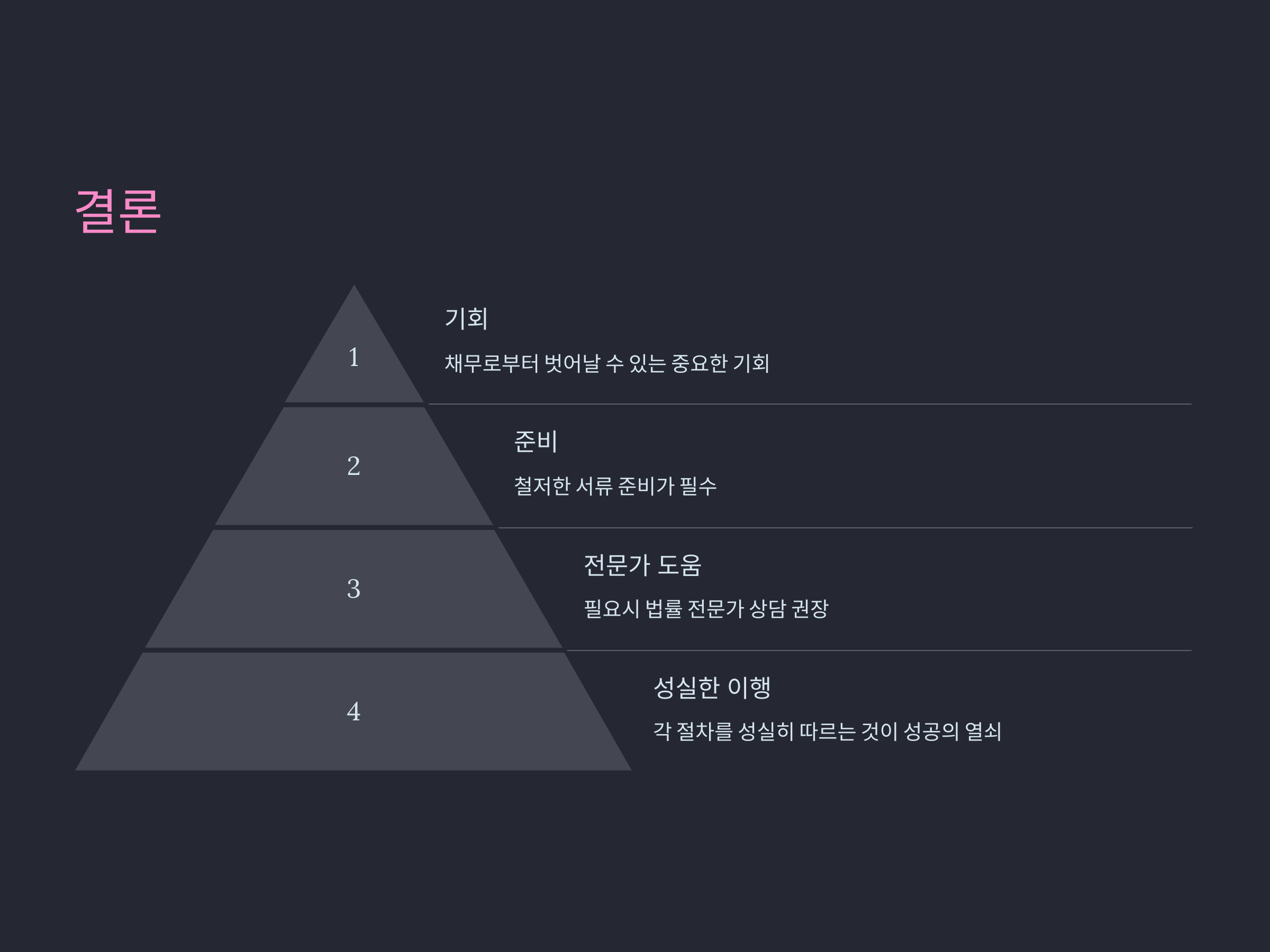 - 일정 기간 성실히 변제한 후 채무 면책을 받을 수 있습니다.