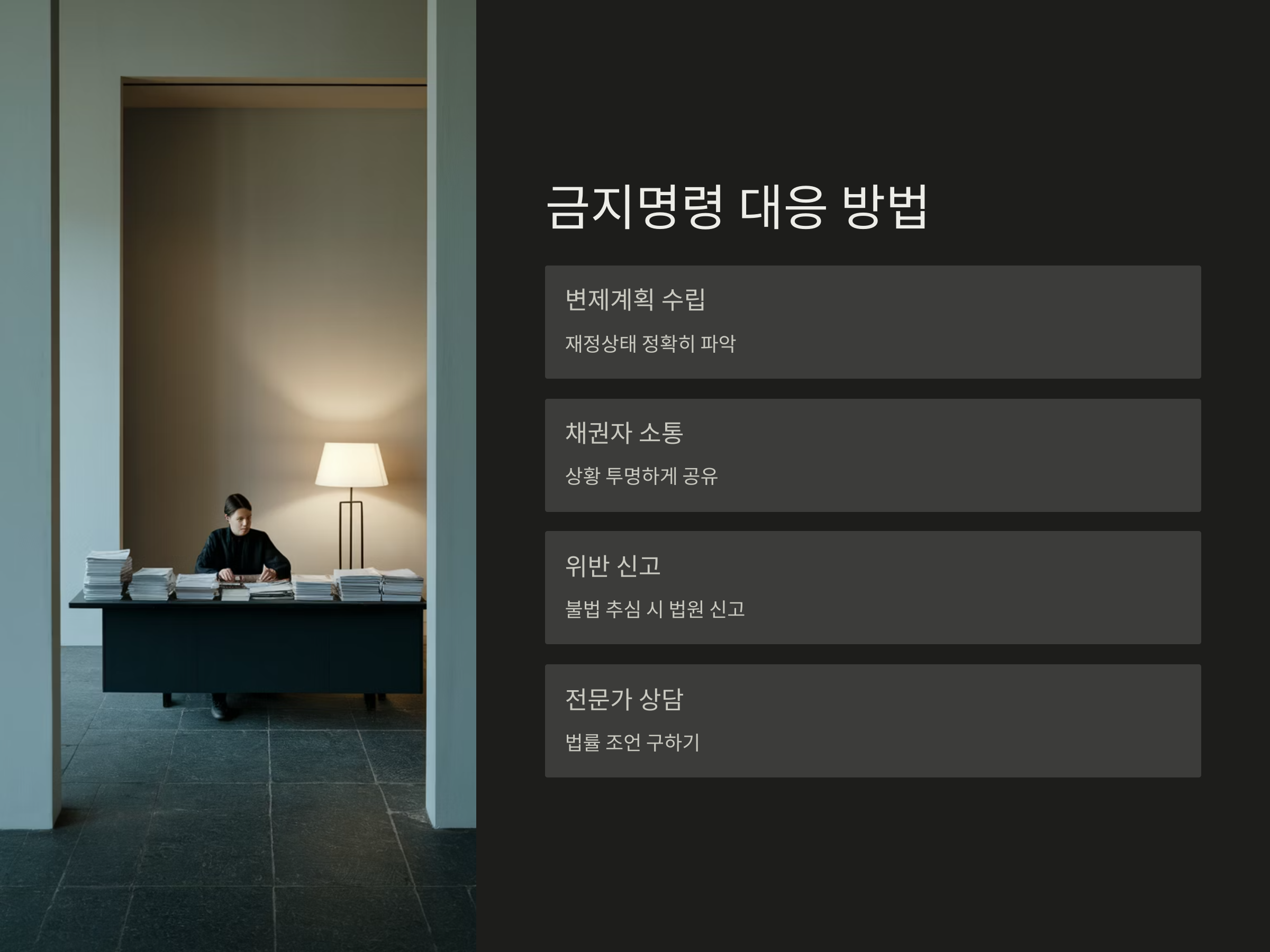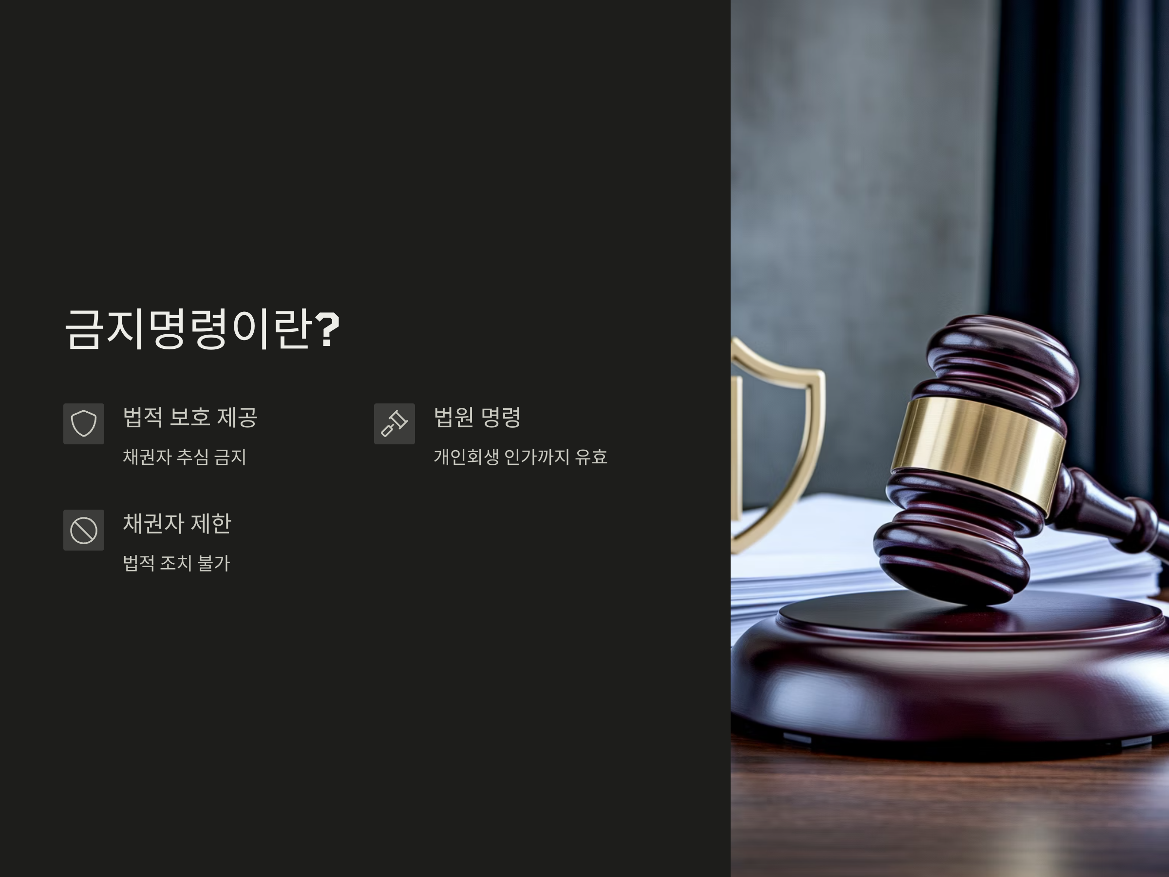 이 명령은 신청자에게 법적 보호를 제공하고, 채권자들의 강제적인 추심을 막아주는 중요한 역할을 합니다. 금지명령이 내려진 후 채권자들은 법원의 승인을 받지 않고는 어떠한 법적 조치를 취할 수 없습니다.