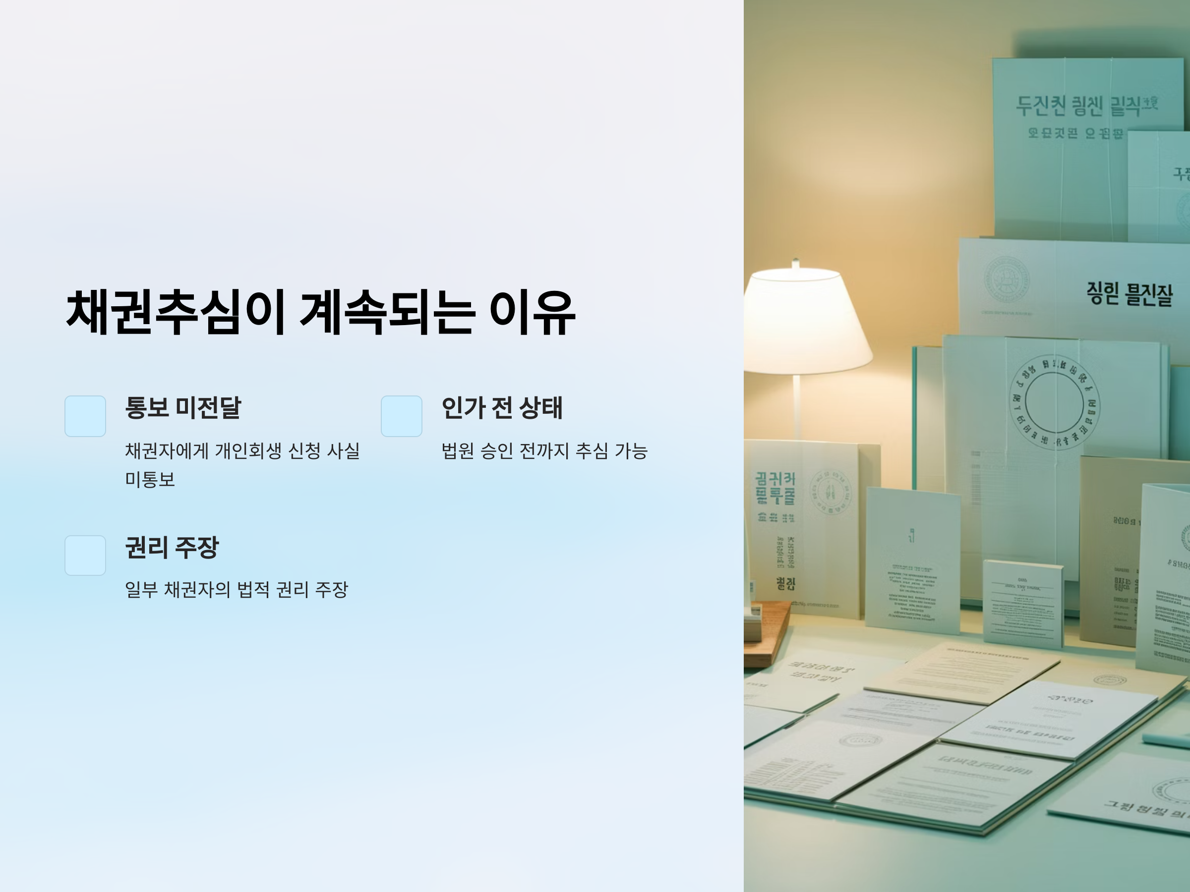 두 번째로는, 개인회생 절차가 아직 법적으로 인가되지 않았을 경우입니다. 개인회생은 신청 후 법원의 승인을 받아야만 진행될 수 있습니다. 이 과정에서 채권자들은 여전히 채권추심을 계속할 수 있습니다. 법원의 인가가 확정되면, 그 이후부터 채권추심이 중단되게 됩니다. 이 과정에서 채권자에게 명확히 통보되었는지 확인하는 것이 중요합니다.