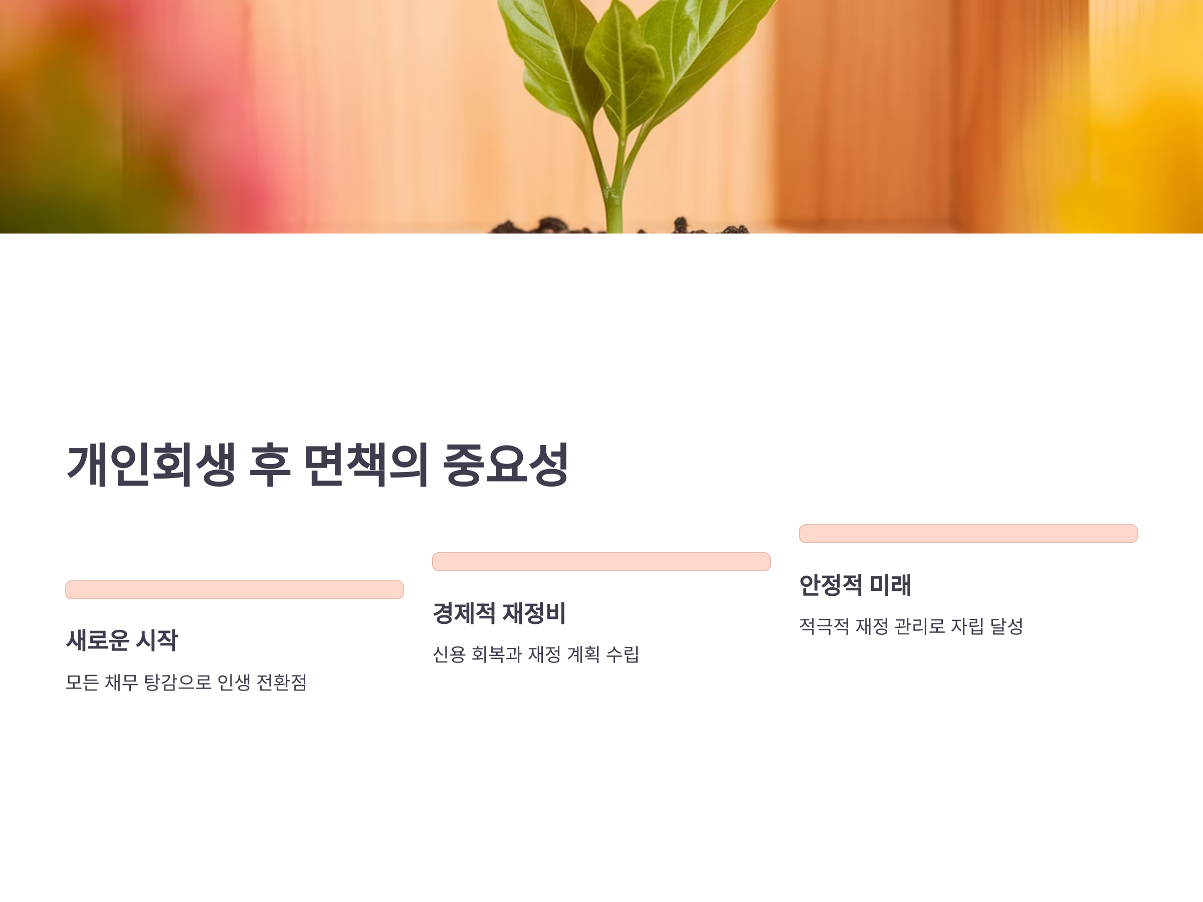 개인회생을 통해 모든 채무를 탕감하고 면책을 받는 것은 중요한 전환점입니다. 면책을 받는 순간부터는 새로운 시작을 할 수 있는 기회를 얻게 되며, 그 기회를 어떻게 활용하느냐에 따라 미래가 달라집니다. 경제적으로 재정비하고, 신용을 회복하며, 새로운 재정 계획을 세워 앞으로의 삶을 더욱 안정적으로 만들어 나가는 것이 중요합니다.