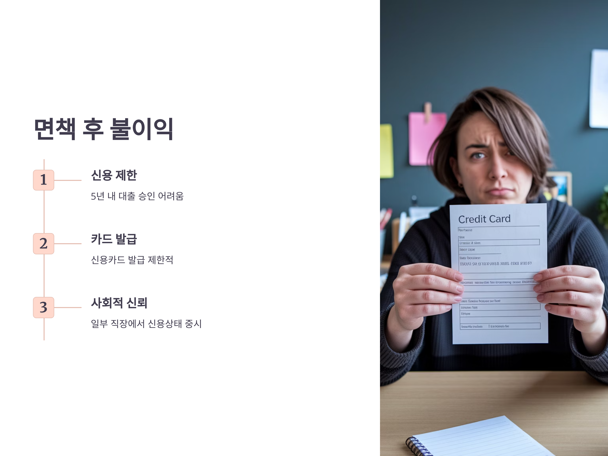 - 대출 및 신용카드 발급: 면책 후 신용도 회복까지 시간이 필요할 수 있으며, 신용카드 발급이나 대출이 어려울 수 있습니다. 그러나 신용 관리에 신경을 쓴다면 시간이 지나면서 신용도를 회복할 수 있습니다.