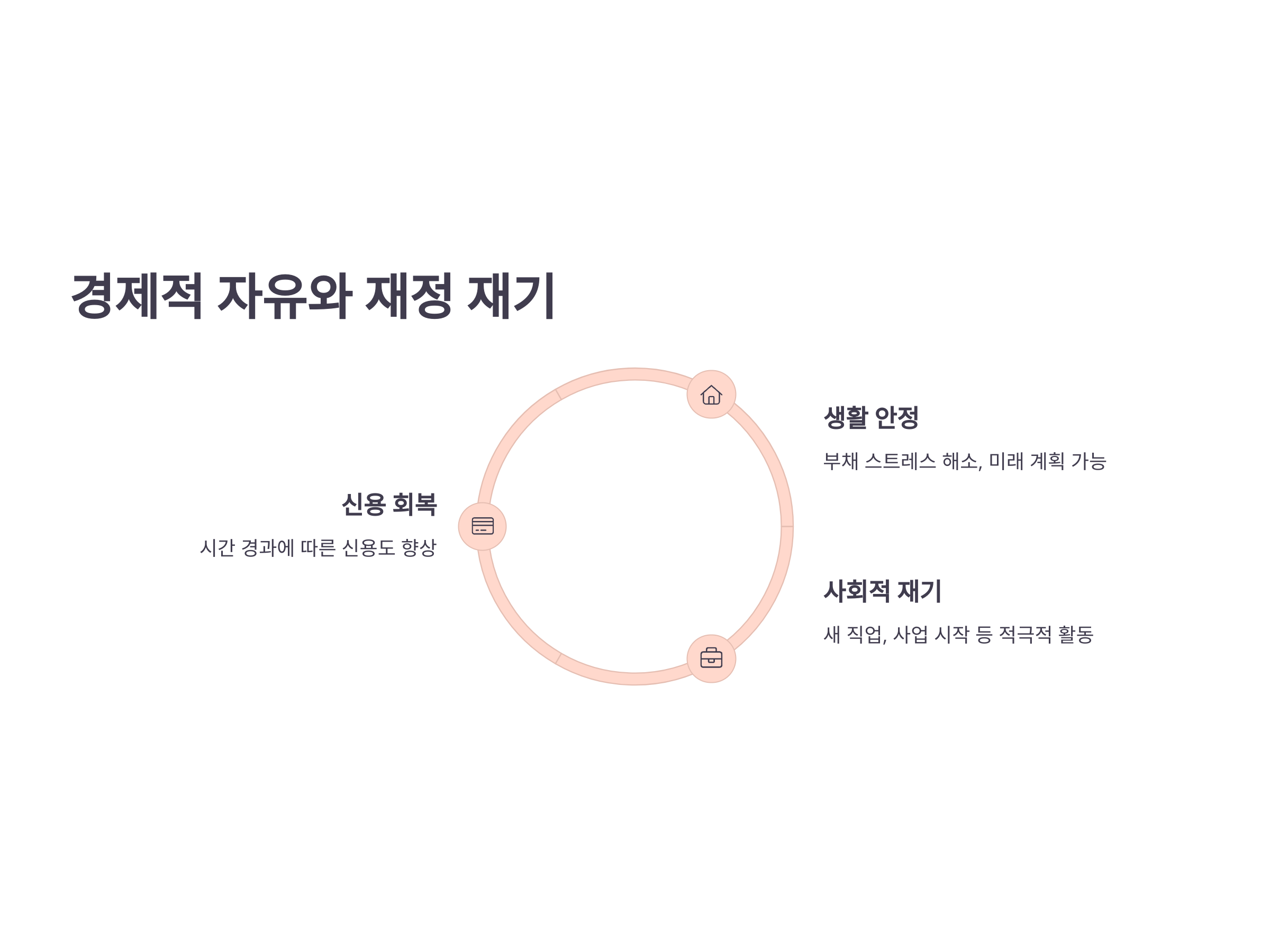 - 생활 안정: 더 이상 과거의 부채로 인해 스트레스를 받지 않으므로 생활이 안정적이 됩니다. 새로운 목표를 세우고 미래를 계획할 수 있는 여유가 생깁니다. 또한, 개인회생 절차를 마친 후 면책을 받은 사람들은 경제적으로 재정비가 가능하며, 사회적 신뢰도도 얻을 수 있습니다.