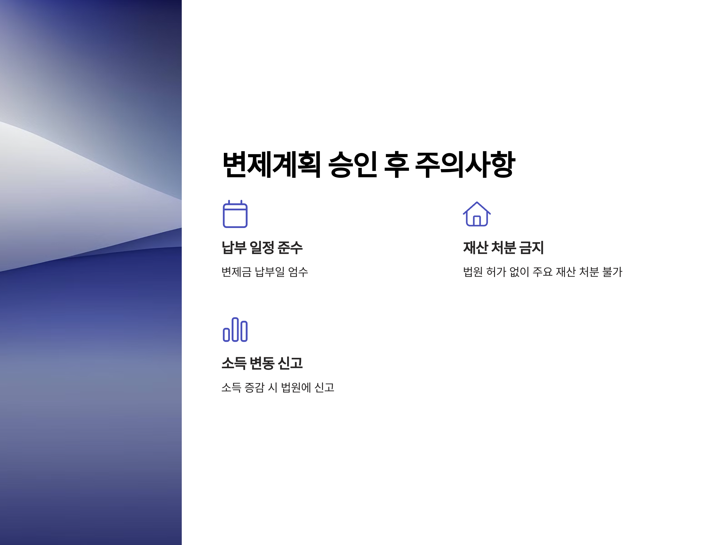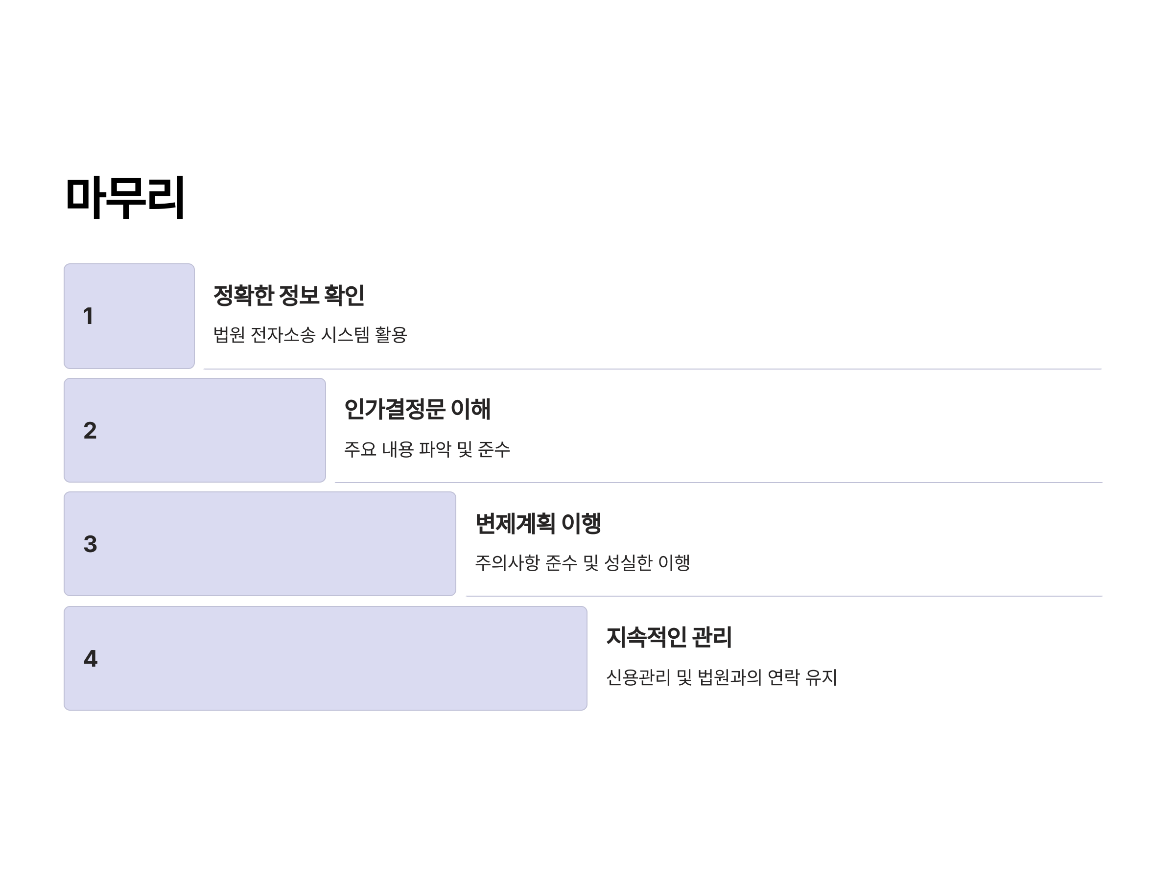 - 납부 일정 준수: 변제금 납부일을 절대 놓치지 말아야 합니다.