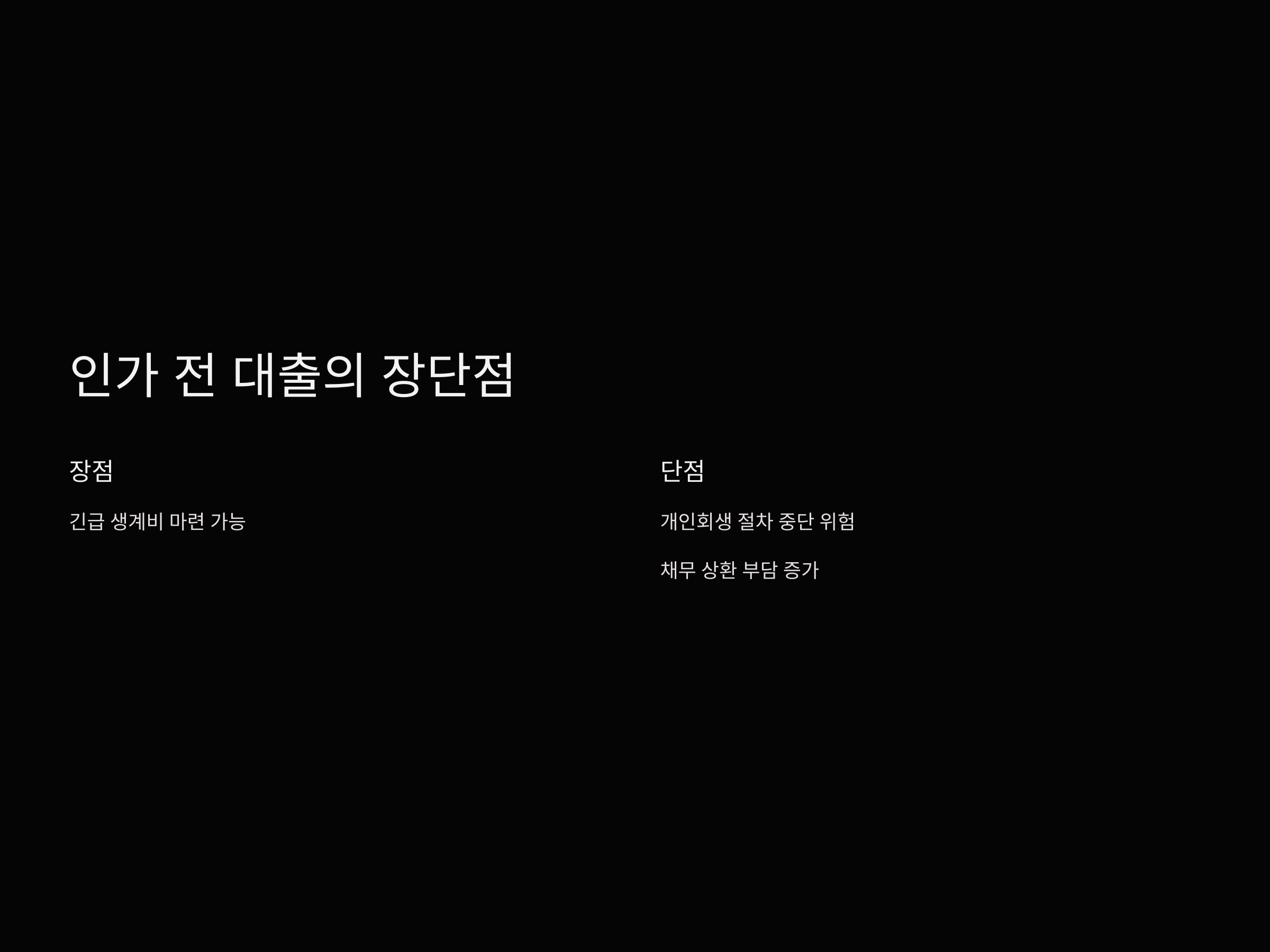 - 단점: 개인회생 절차가 중단될 위험 증가, 채무 상환 부담 증가.