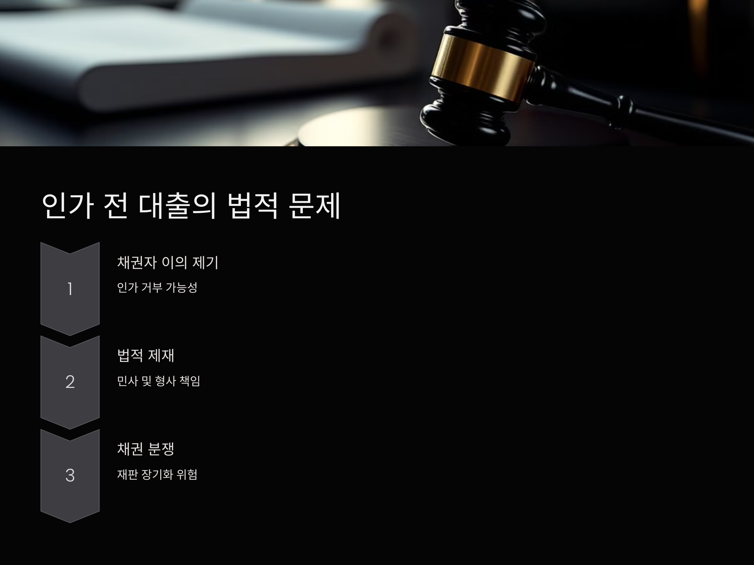 인가 전 대출은 법적 문제로 이어질 수 있으며, 특히 채권자가 이의를 제기하는 경우 문제가 복잡해질 수 있습니다.