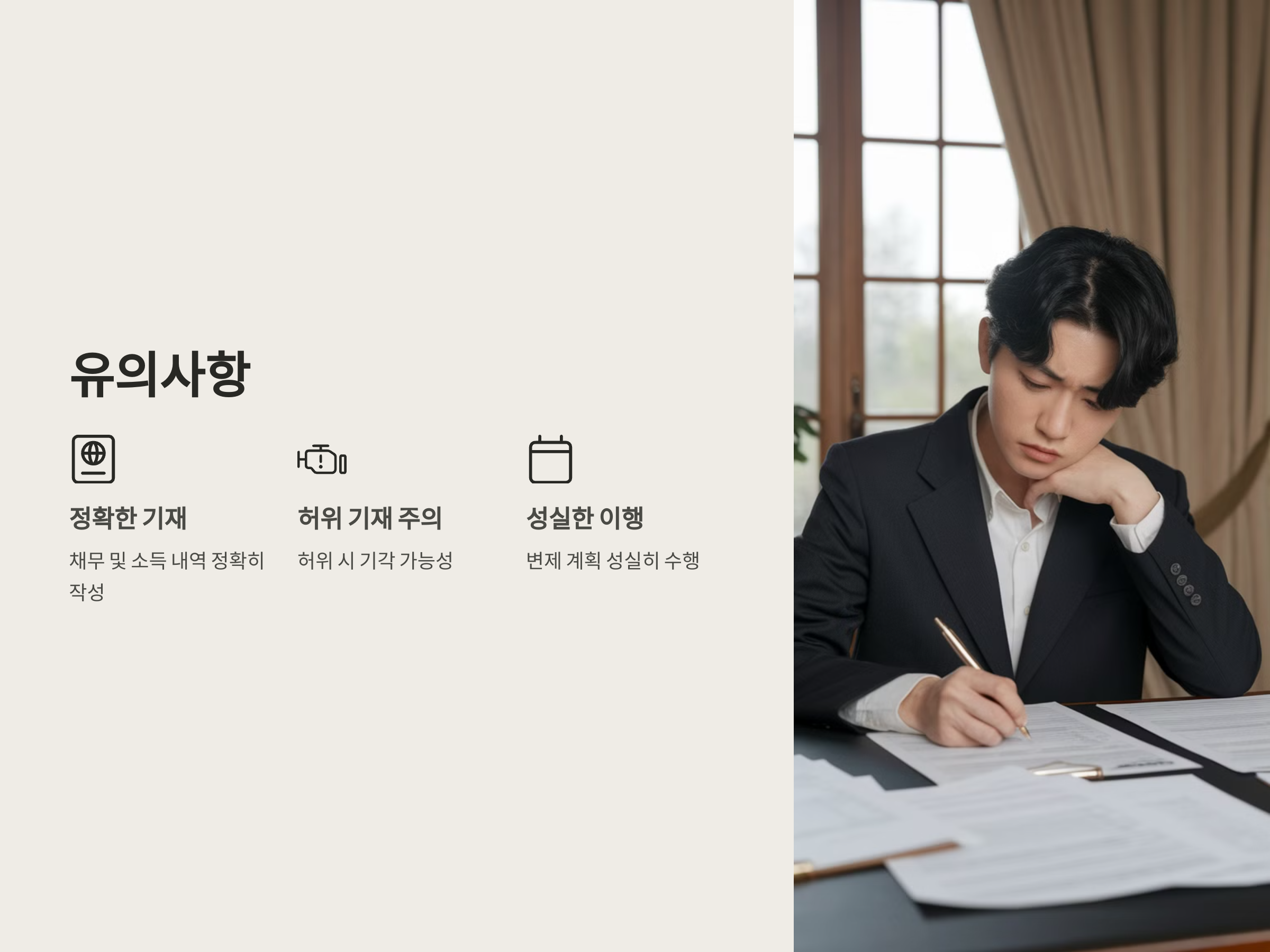 - 신청서 작성 시 정확한 채무 및 소득 내역을 기재해야 합니다.