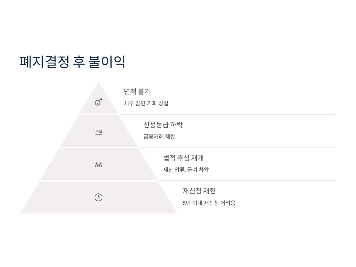 폐지결정이 내려지면 개인회생 절차는 그 즉시 종료되며, 가장 큰 불이익은 ‘면책 불가’입니다. 즉, 변제를 다 마치지 못했더라도 일부라도 면책받을 수 있는 기회가 사라진다는 뜻입니다. 이는 곧 모든 채무가 다시 유효해지며, 채권자들이 법적 추심을 재개할 수 있음을 의미합니다.