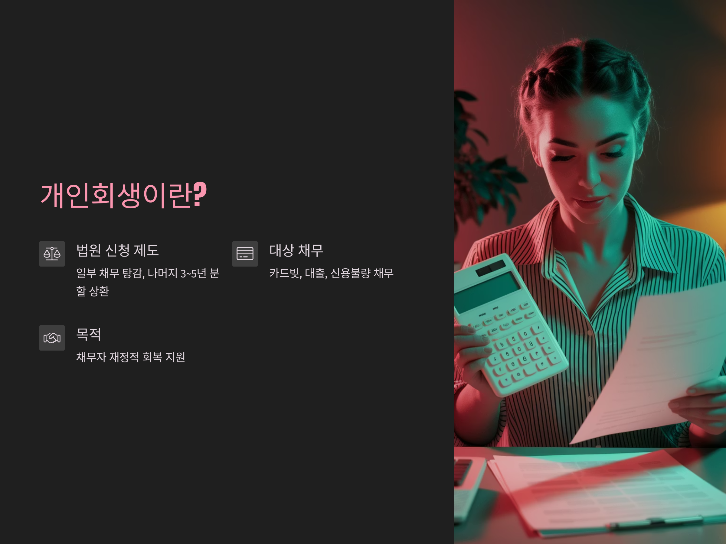 개인회생은 과도한 채무로 어려움을 겪고 있는 개인이 법원에 신청하여 일정 부분의 채무를 탕감받고, 나머지 채무는 3~5년 동안 분할 상환하는 제도입니다. 이 제도의 목적은 채무자에게 갚을 수 있는 능력을 부여하고, 채무자의 재정적 회복을 돕기 위해 마련되었습니다. 개인회생을 통해 채무자는 매월 일정 금액을 상환하면서, 잔여 채무를 탕감받을 수 있는 기회를 가질 수 있습니다.