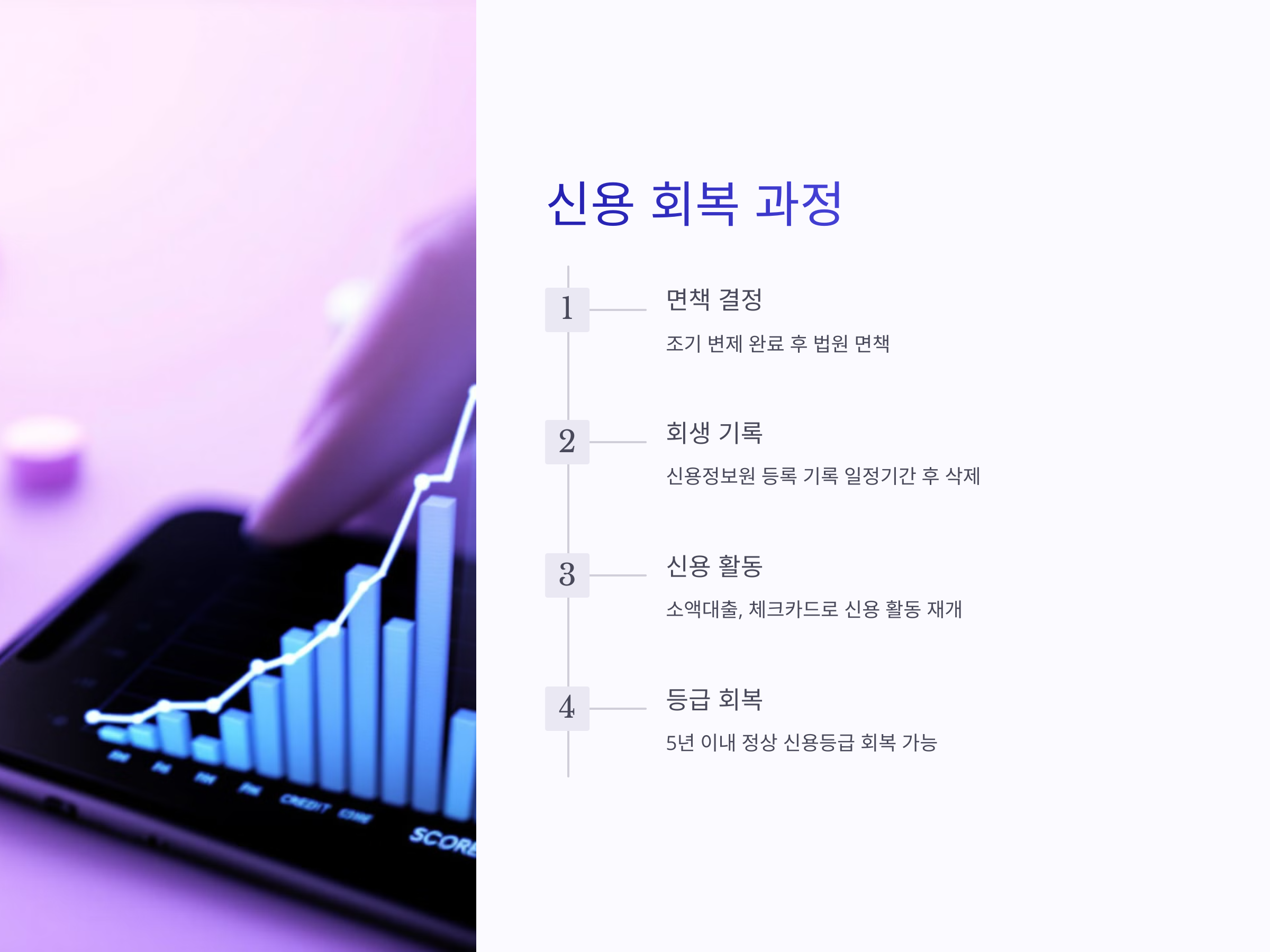 조기 변제를 마치면 면책이 이루어지면서 신용 회복이 시작됩니다. 한국신용정보원 등에 등록된 회생 기록은 일정 기간 이후 삭제되며, 보통 5년 이내에 정상 신용 등급으로 회복이 가능합니다. 회복 속도를 높이기 위해서는 이후 금융 거래에서 연체 없이 성실히 상환하는 것이 중요합니다. 또한 소액 대출이나 체크카드 사용 등으로 신용 활동을 다시 시작하는 것도 도움이 됩니다. 금융기관에 따라 차이가 있으므로 사전 상담을 받아보는 것도 추천합니다.