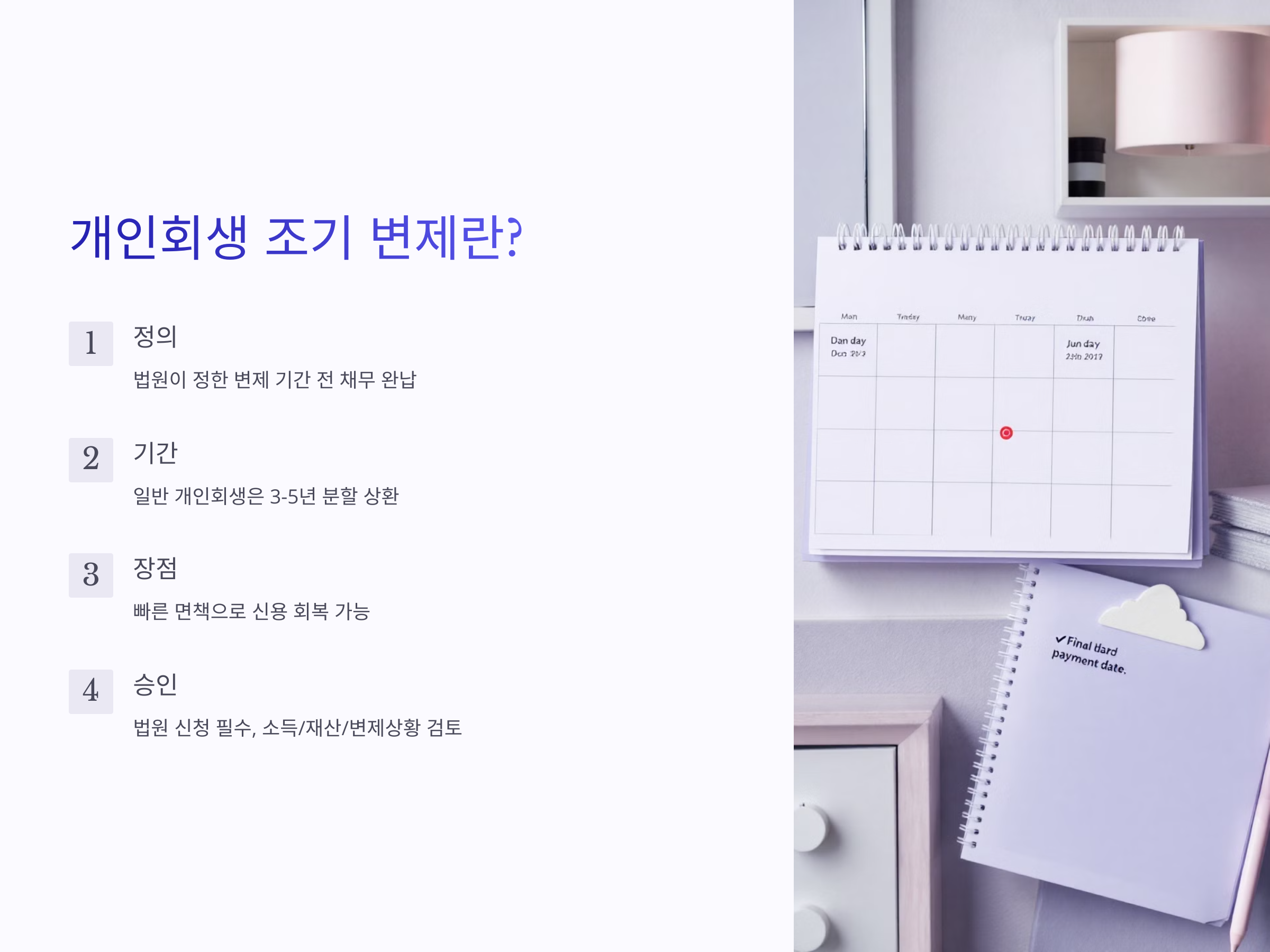 개인회생 조기 변제는 법원이 정한 변제 계획 기간이 끝나기 전에 채무를 완납하는 제도입니다. 일반적으로 개인회생은 3년에서 5년 동안 일정 금액을 분할 상환하는 구조인데, 경제적 여건이 좋아지거나 예상치 못한 수입이 발생했을 때 남은 채무를 한 번에 갚고 빠르게 면책을 받고자 하는 사람들이 많습니다. 조기 변제의 가장 큰 장점은 빠른 면책으로 신용 회복이 가능하고, 매달 납부해야 하는 부담을 조기에 끝낼 수 있다는 점입니다. 다만, 무조건적으로 허용되는 것이 아니라 법원에 신청하여 승인을 받아야만 합니다. 이때 법원은 신청인의 소득, 재산, 변제 상황을 종합적으로 검토합니다.