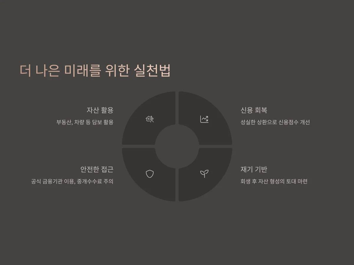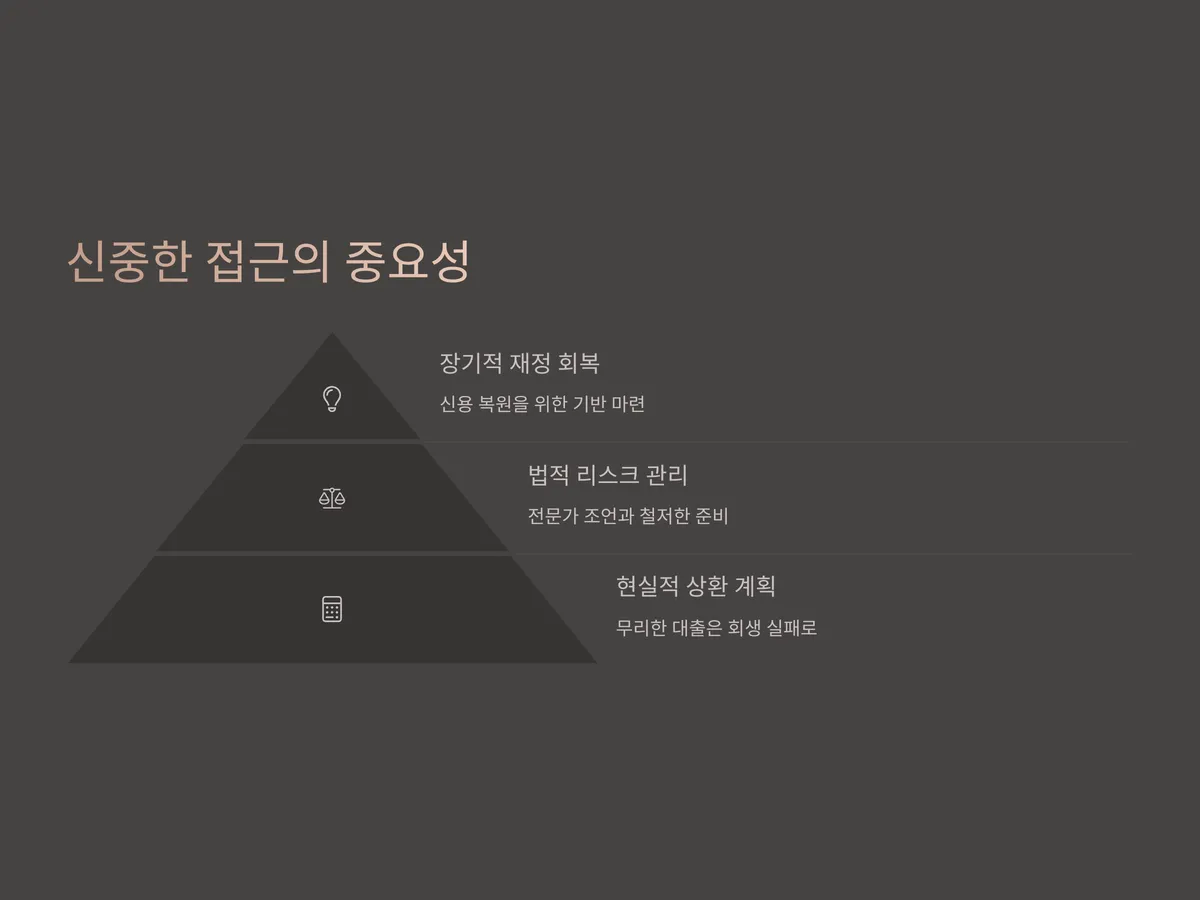 이러한 금융기관들은 대출 심사에 있어 '담보 가치 평가'를 매우 중시하며, 담보에 따라 최대 수억원 대까지 대출 가능성이 있습니다. 다만, 고금리 조건이 붙을 수 있고 일부는 대출 심사 시 회생 관련 서류 일체를 요구하므로 사전 준비가 필수적입니다. 또한, 중개 업체를 통해 접근하는 경우 수수료나 불합리한 조건에 주의해야 하며, 반드시 금융감독원 등록된 정식 업체인지 확인해야 합니다.