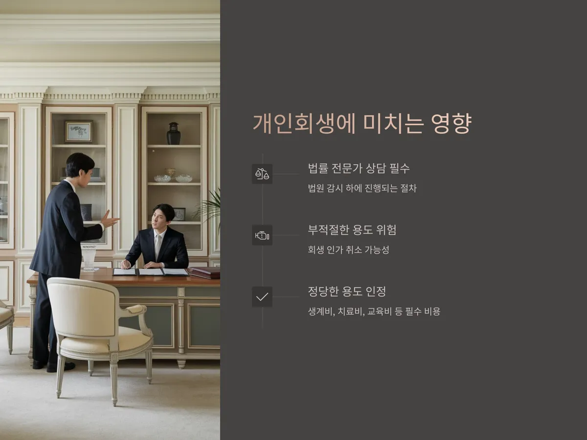 개인회생 절차 중 담보대출을 받게 되면 법원의 감시 하에 있는 상황이므로 반드시 변호사 또는 법률 전문가와 상의해야 합니다. 대출금 사용 목적이 법원의 변제계획안과 충돌할 경우 문제가 발생할 수 있으며, 경우에 따라 개인회생 인가가 취소될 수도 있습니다.