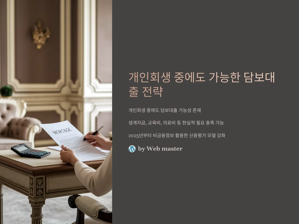 개인회생 절차를 진행 중이라면 '대출'이라는 단어 자체가 큰 벽처럼 느껴질 수 있습니다. 하지만 현실적인 생계자금, 자녀 교육비, 혹은 갑작스러운 의료비 등은 개인회생 중에도 꾸준히 발생하기 마련입니다. 이런 상황에서 '담보대출'은 신용 문제로 인해 제한적인 선택지를 가진 이들에게 하나의 대안이 될 수 있습니다. 최근 금융시장은 연체자나 개인회생자를 위한 맞춤형 상품을 속속 내놓고 있으며, 2025년부터는 비금융정보를 활용한 신용평가 모델이 강화되면서 새로운 기회를 제공하고 있습니다.