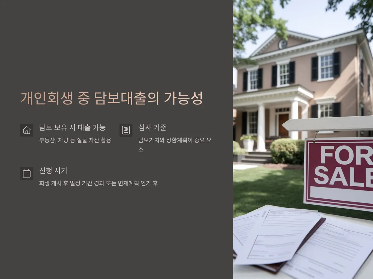 개인회생 절차 중이라도 담보를 보유하고 있다면, 일정 조건 하에 담보대출을 진행할 수 있습니다. 특히 부동산이나 차량 같은 실물 자산이 있다면 담보로 활용할 수 있으며, 대출 심사 시 담보가치와 상환계획이 중요한 요소로 작용합니다. 이때 담보물에 대한 감정평가가 진행되며, 개인회생자라 하더라도 담보의 가치가 충분하다면 심사 승인을 받을 가능성은 존재합니다.