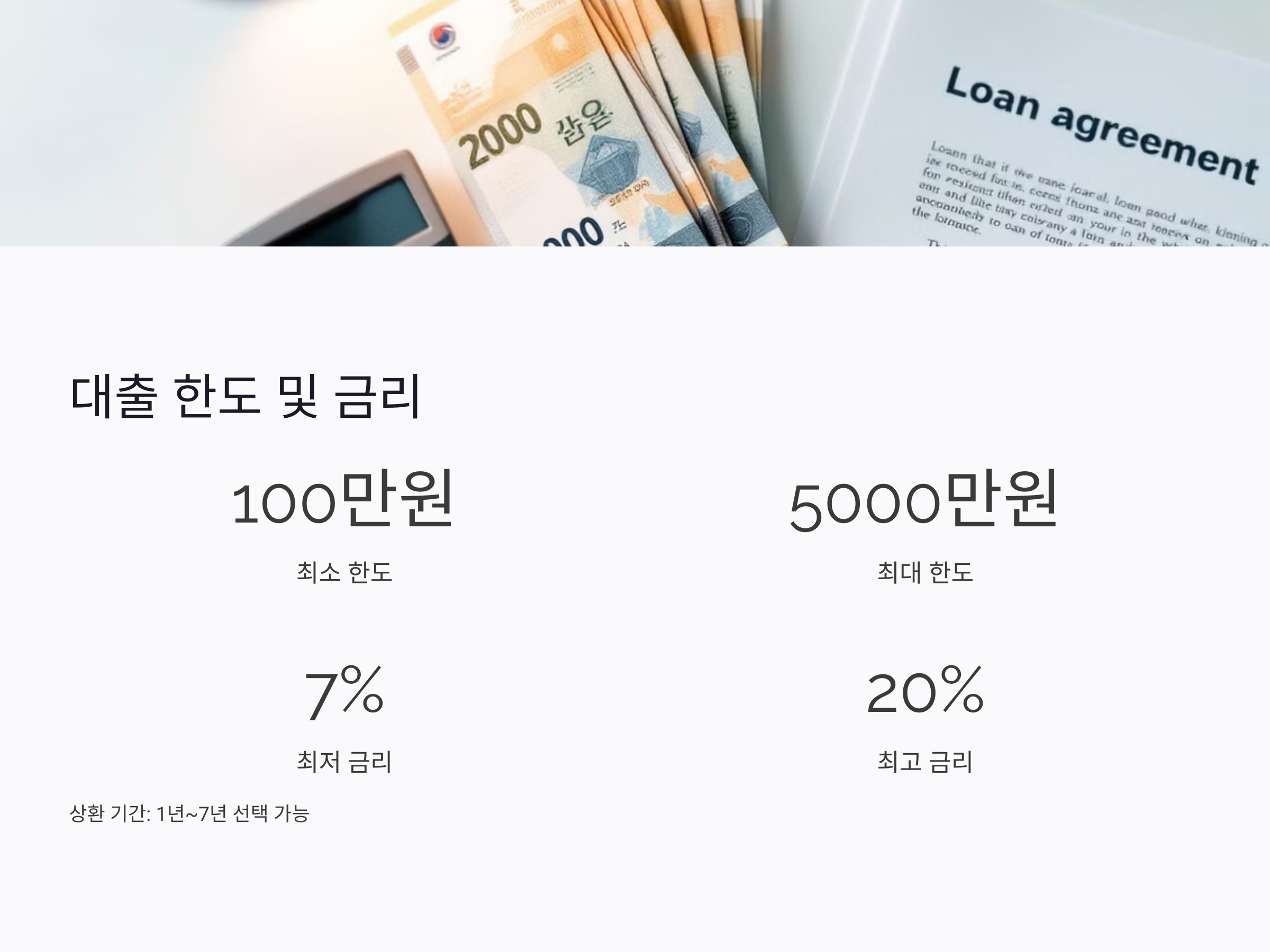 - 금리: 연 7%에서 20% 사이로 설정되며, 다른 대출 상품 대비 합리적인 수준을 유지하고 있습니다. 다만, 신용 상태와 대출 기간에 따라 다소 변동될 수 있습니다.
