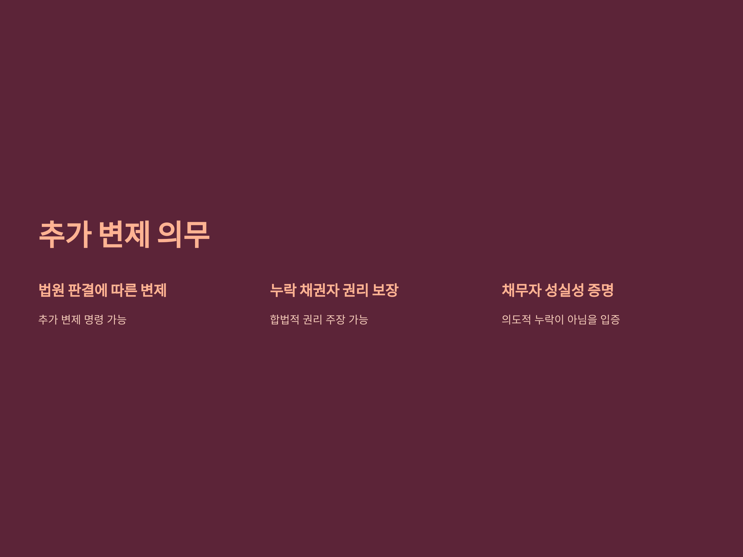 - 법원의 판결에 따라 변제: 법원은 누락된 채권의 변제 여부를 판단하며, 추가 변제를 명령할 수 있습니다.