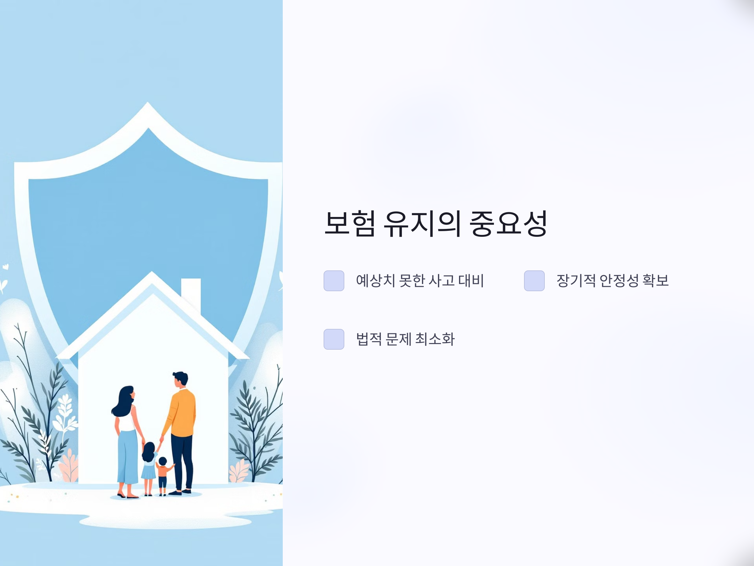 개인회생은 채무를 줄이는 데 집중하지만, 보험은 불확실한 미래에 대비할 수 있는 도구입니다. 보험을 유지해야 하는 주요 이유는 다음과 같습니다: