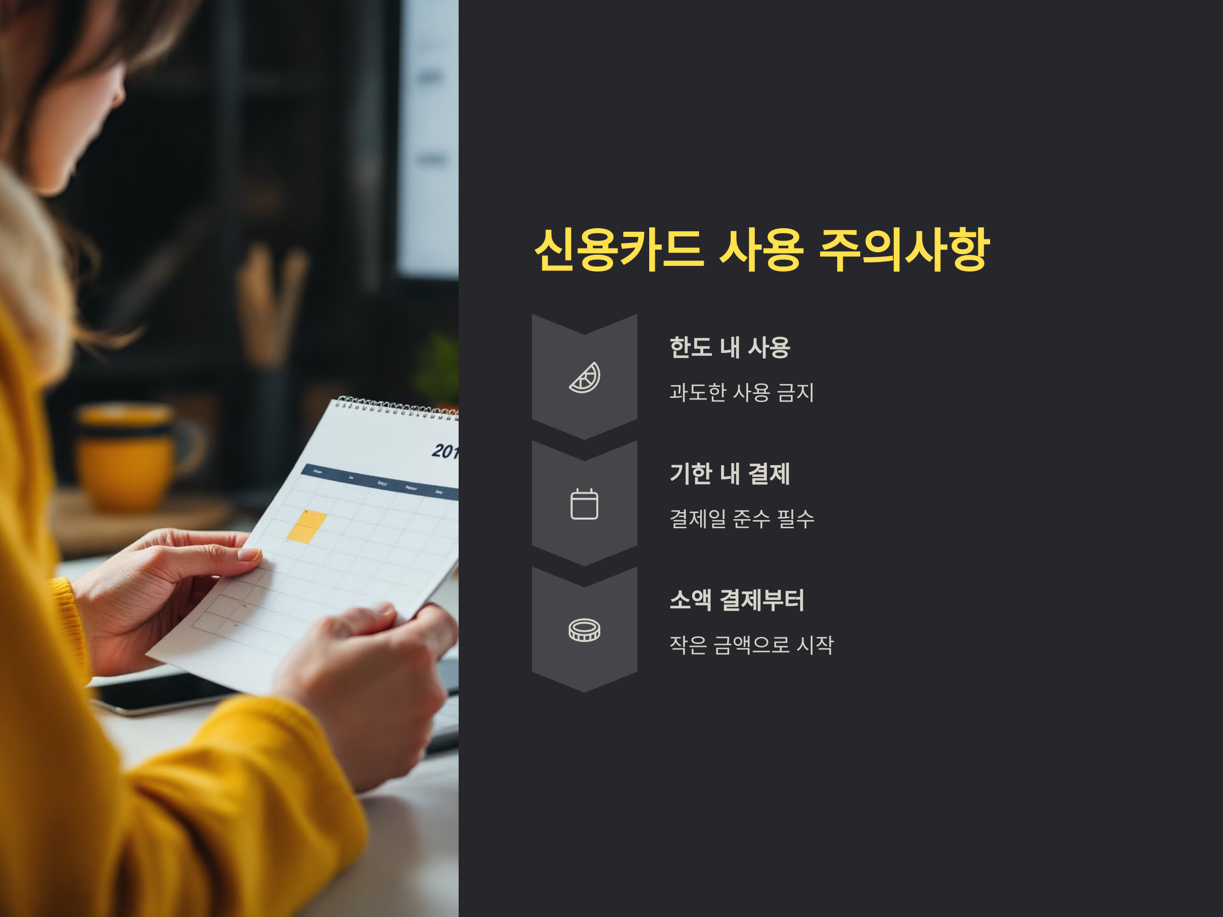 - 한도 내 사용: 카드를 발급받았다고 해서 한도를 초과해 과도하게 사용하는 것은 매우 위험합니다. 반드시 사용 한도를 지키면서 사용해야 하며, 카드 사용 내역은 매달 정리하여 결제 능력에 맞는 선에서 소비를 해야 합니다.