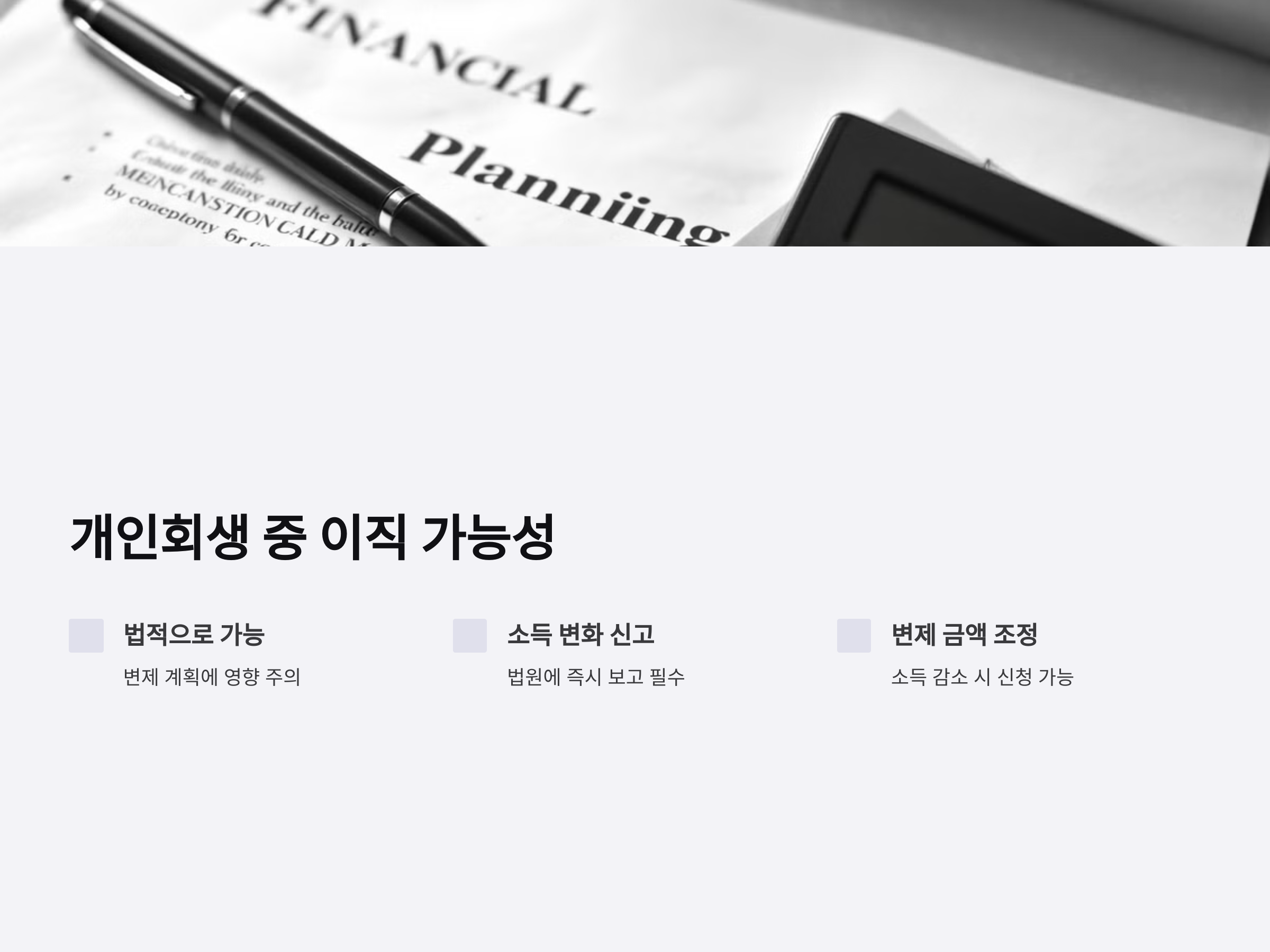 - 이직 시기: 개인회생 초기에는 절차 안정화를 위해 변화를 최소화하는 것이 좋습니다.